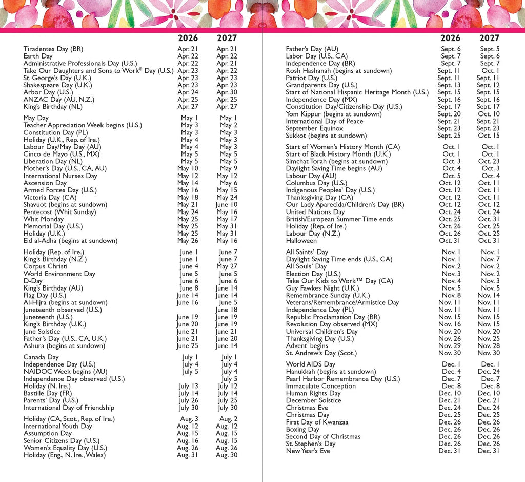 Includes a page to note birthdays, anniversaries, and other dates to remember.