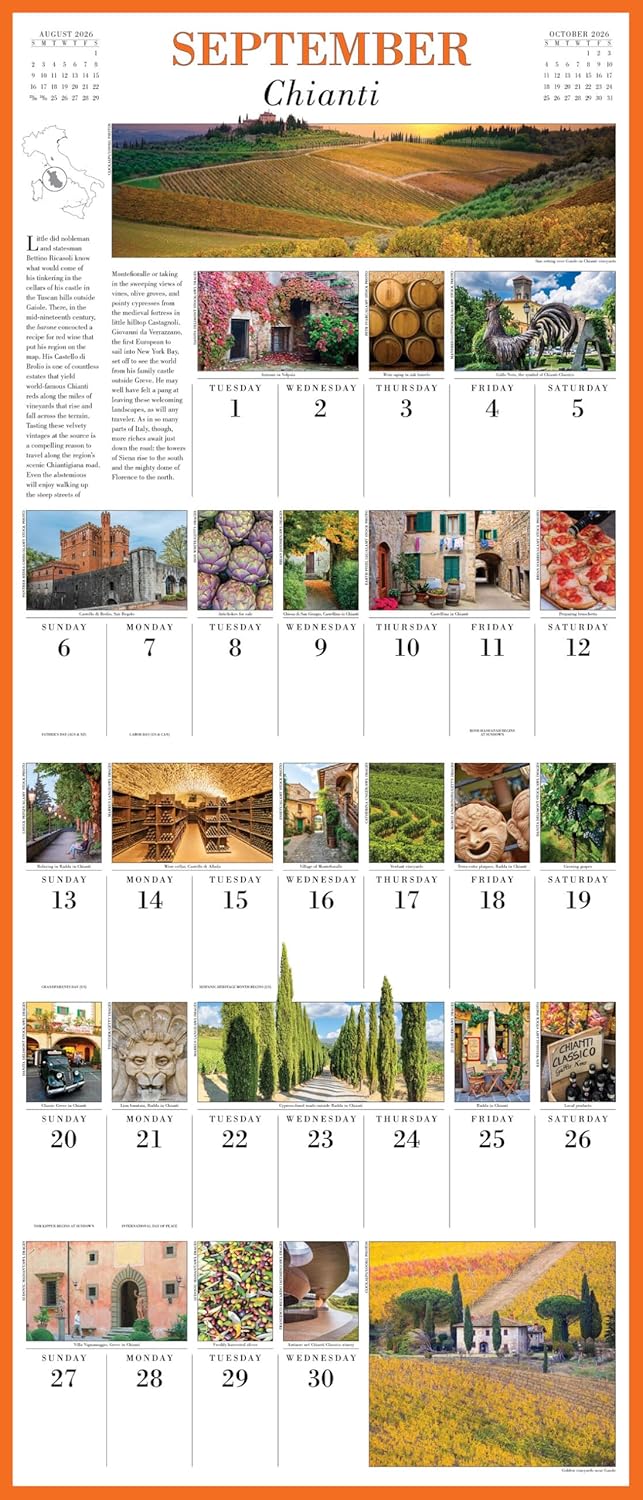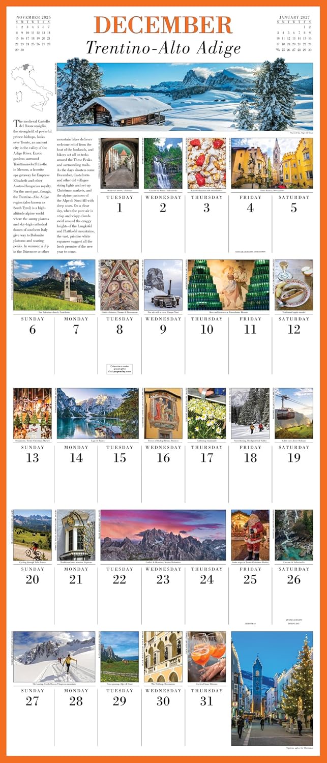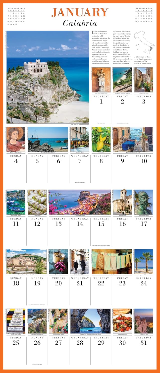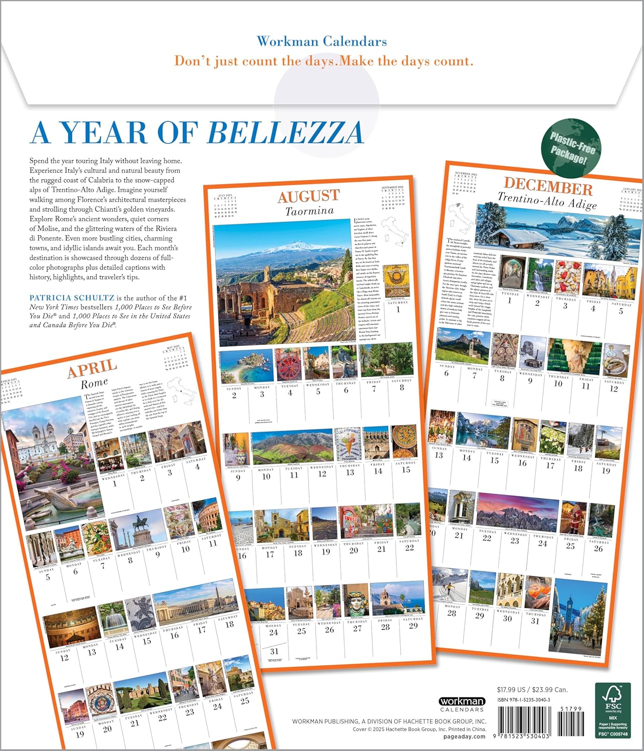 BUCKET LIST DESTINATIONS: Experience Italy’s most beautiful sights, including Calabria, Rome, Riviera di Ponente, Lombardy, Taormina, and more in stunning full-color photos throughout the monthly grid.