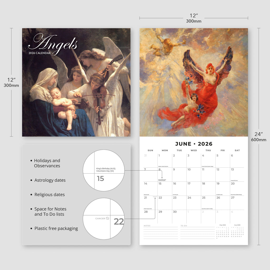 Packaged in a 100% plastic-free, sustainable, FSC-certified envelope, this 2026 Angels Square Wall Calendar from Red Robin Publishing Ltd includes 12 months plus 4 bonus months, providing extended planning and a full year of enjoyment. .