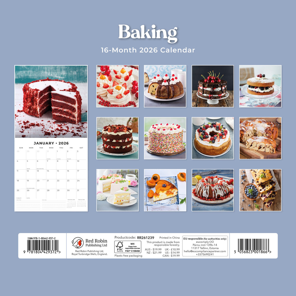 Packaged in a 100% plastic-free, sustainable, FSC-certified envelope, this 2026 Baking Square Wall Calendar from Red Robin Publishing Ltd includes 12 months plus 4 bonus months, providing extended planning and a full year of enjoyment. .