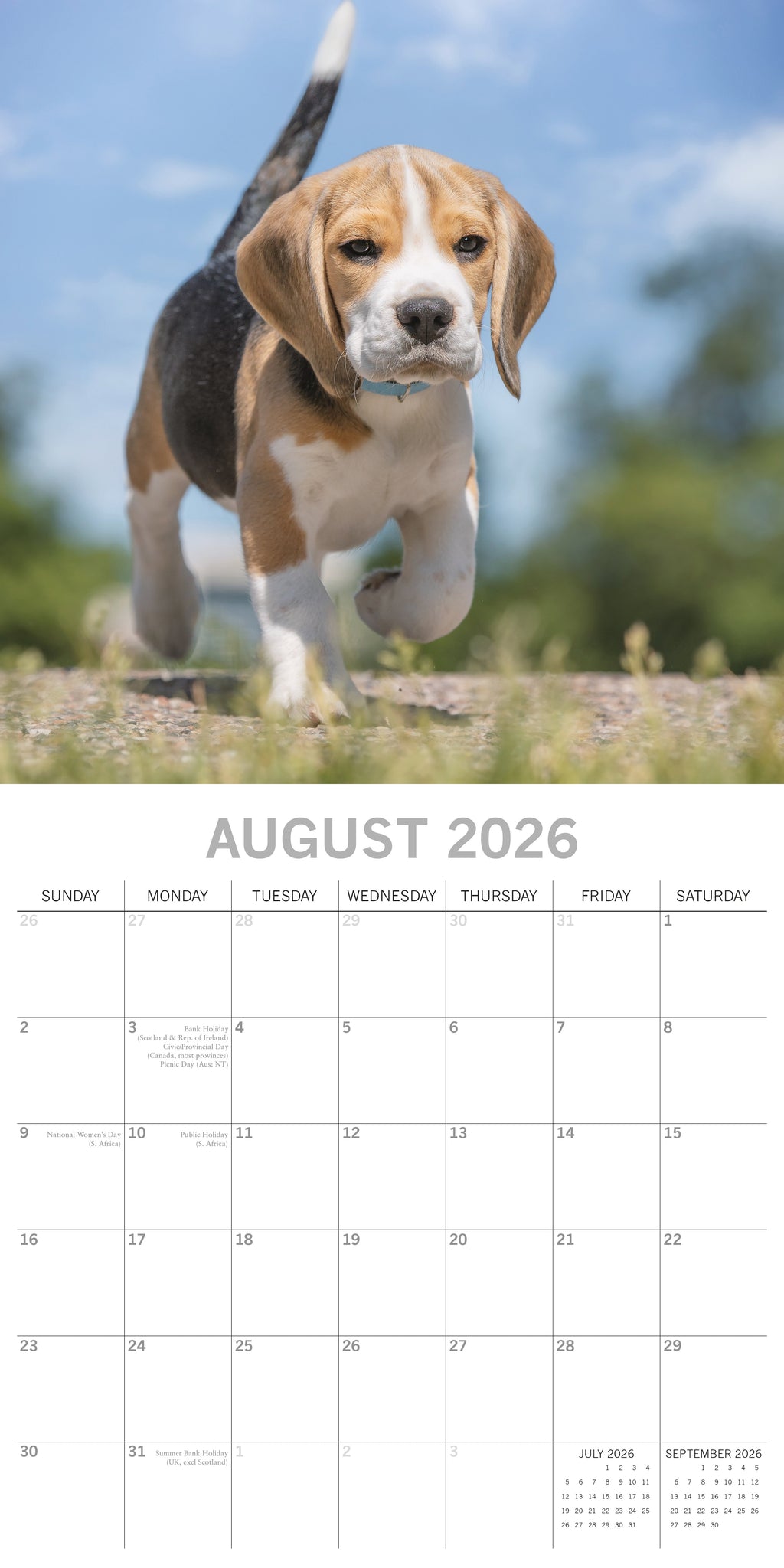The 2026 Beagles Square Wall Calendar spans 16 months—from September 2025 through December 2026—with the final four months of 2025 presented in a compact, mini-grid format. Each monthly spread begins on Sunday, with the top half showcasing a beautiful image and the bottom half featuring an easy-to-read monthly layout. The calendar comes shrink-wrapped for protection. .