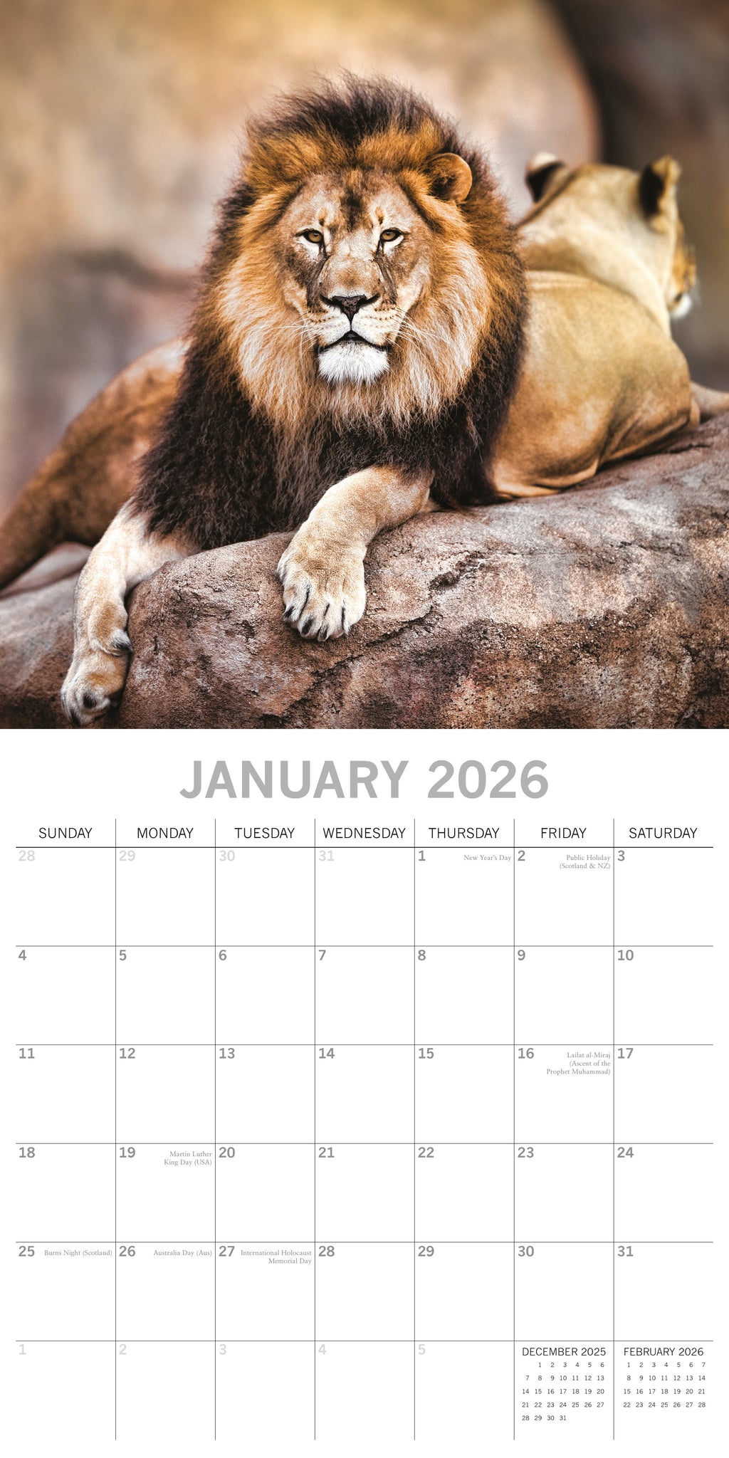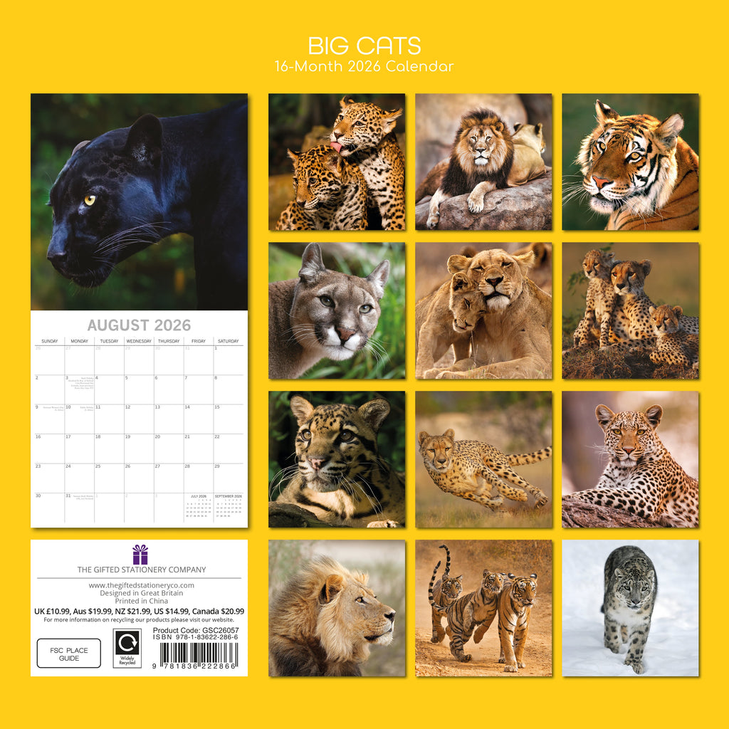 The 2026 Big Cats Square Wall Calendar spans 16 months—from September 2025 through December 2026—with the final four months of 2025 presented in a compact, mini-grid format. Each monthly spread begins on Sunday, with the top half showcasing a beautiful image and the bottom half featuring an easy-to-read monthly layout. The calendar comes shrink-wrapped for protection. .