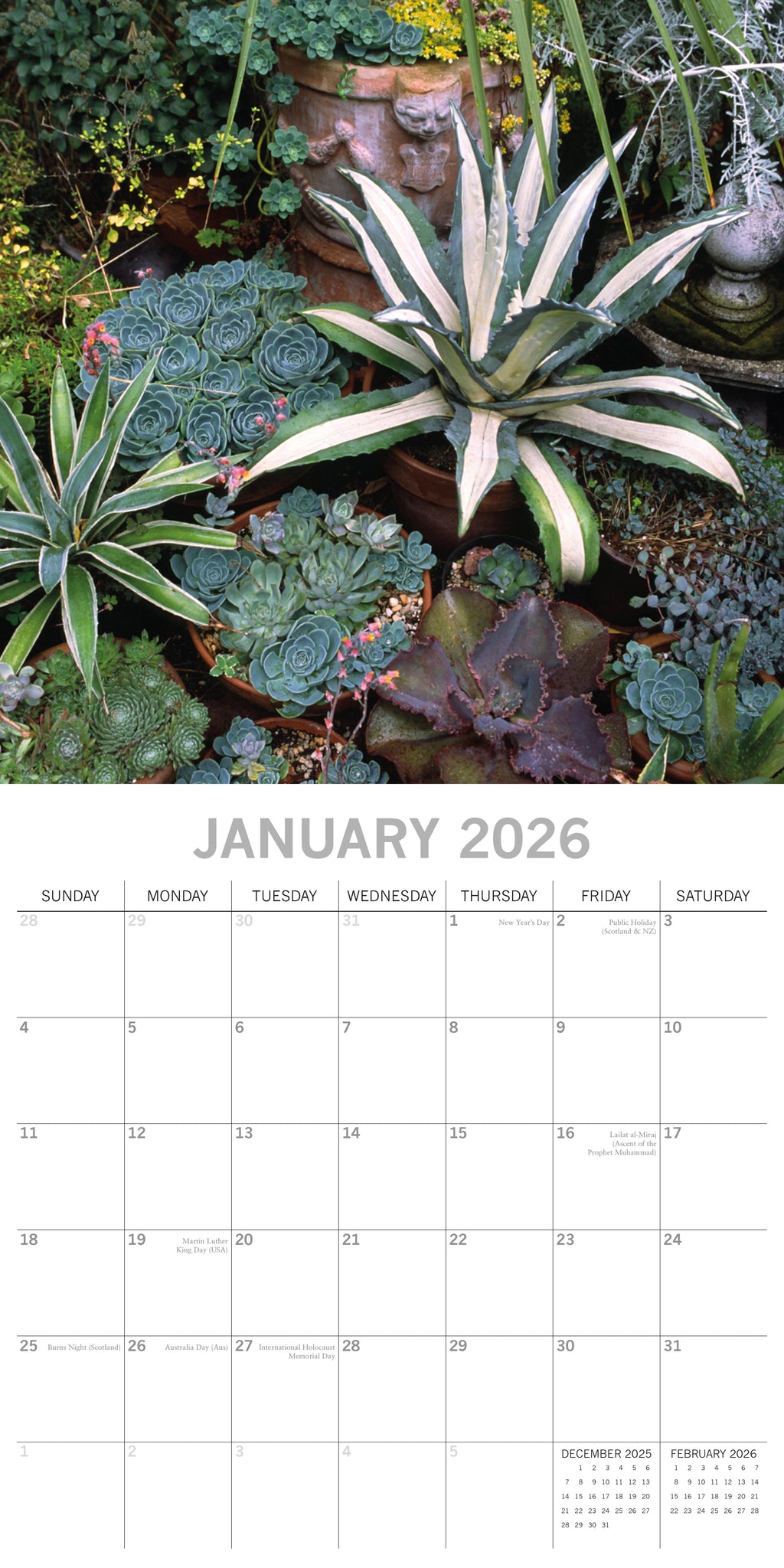 The 2026 Cacti & Succulents Square Wall Calendar spans 16 months—from September 2025 through December 2026—with the final four months of 2025 presented in a compact, mini-grid format. Each monthly spread begins on Sunday, with the top half showcasing a beautiful image and the bottom half featuring an easy-to-read monthly layout. The calendar comes shrink-wrapped for protection. .