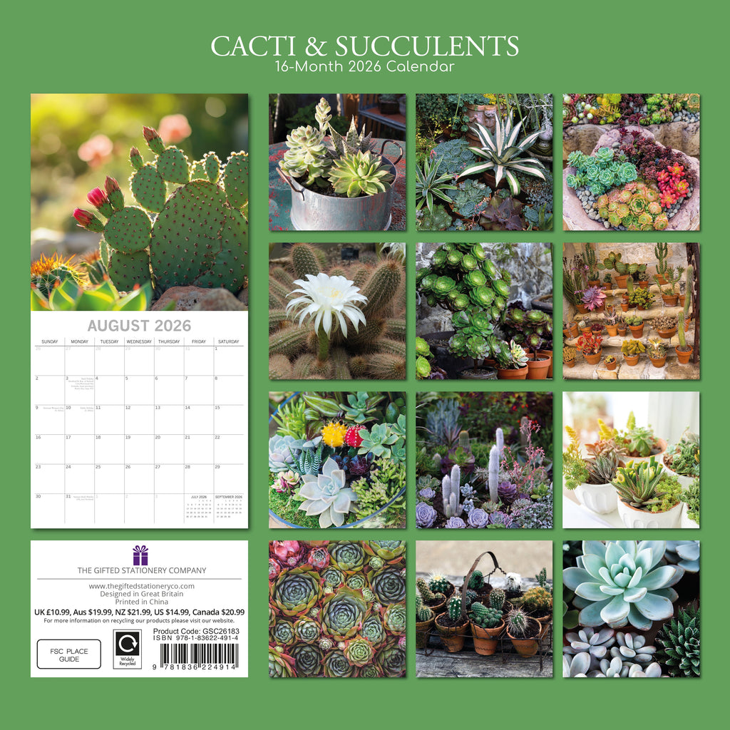 This exquisitely designed 2026 Cacti & Succulents Square Wall Calendar from The Gifted Stationery Co. is ideal for your home or office and makes a thoughtful holiday gift for your loved ones. It features 13 stunning images of Cacti & Succulents and includes large date grids for jotting down appointments, birthdays, and other important events. When opened, it measures 30 x 60 cm.