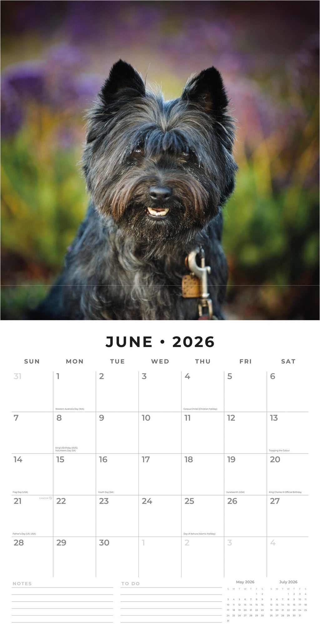 Packaged in a 100% plastic-free, sustainable, FSC-certified envelope, this 2026 Cairn Terriers Square Wall Calendar from Red Robin Publishing Ltd includes 12 months plus 4 bonus months, providing extended planning and a full year of enjoyment. .