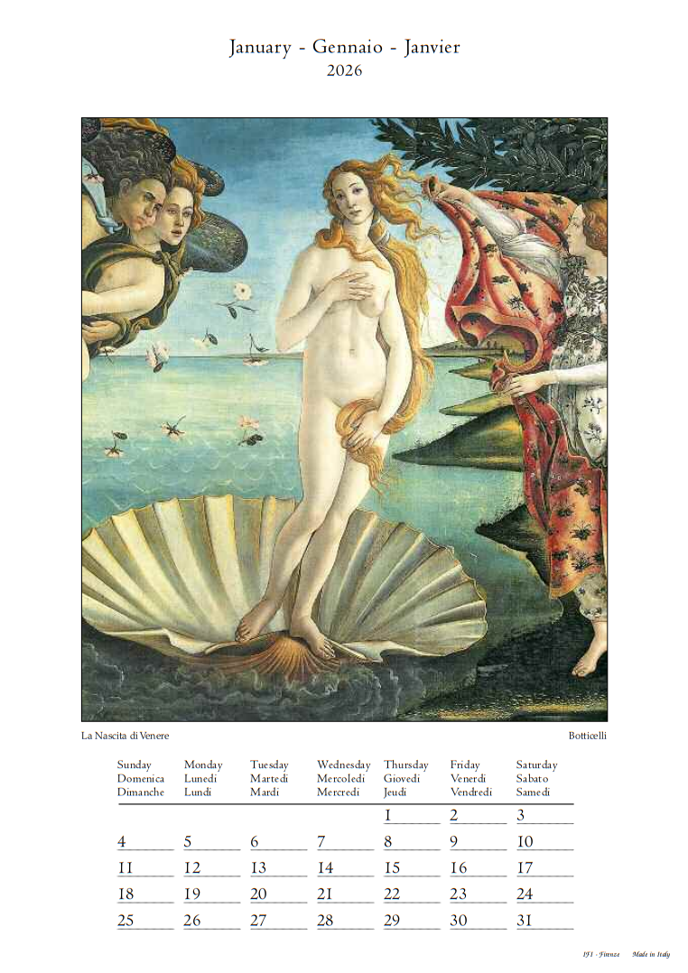 Discover FlorenceÕs masterpieces with the Capolavori di Firenze Ð 2026 Art Calendar. Each month features classic artwork that celebrates the cityÕs rich artistic heritage and timeless beauty.