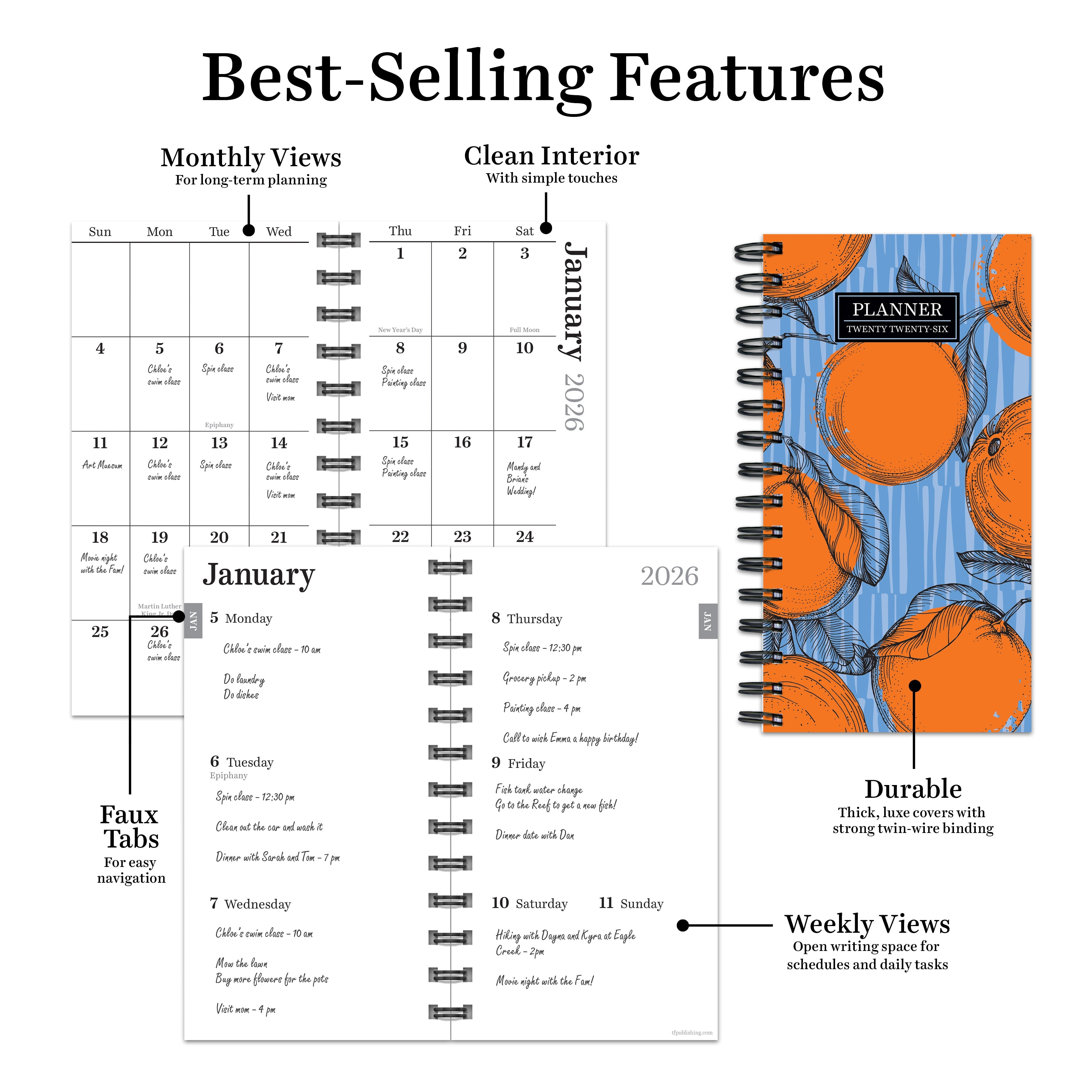• Inside pages are designed with faux monthly tabs for easy access to weekly planning