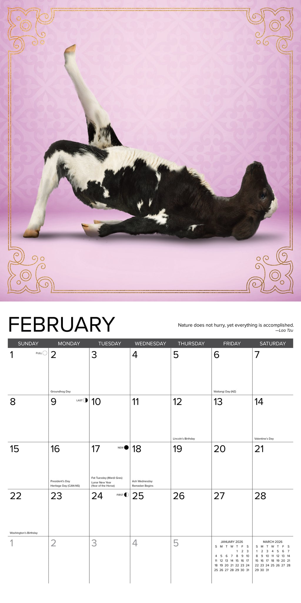 Fascination with yoga is sweeping pastures throughout the world. Cows are turning to this ancient discipline in herds to reap the benefits of relaxation, flexibility and increased milk production. Twelve classic cow poses, including Downward Facing Bovine (Udder Mooca Svavasana), are aptly demonstrated in this unique calendar.