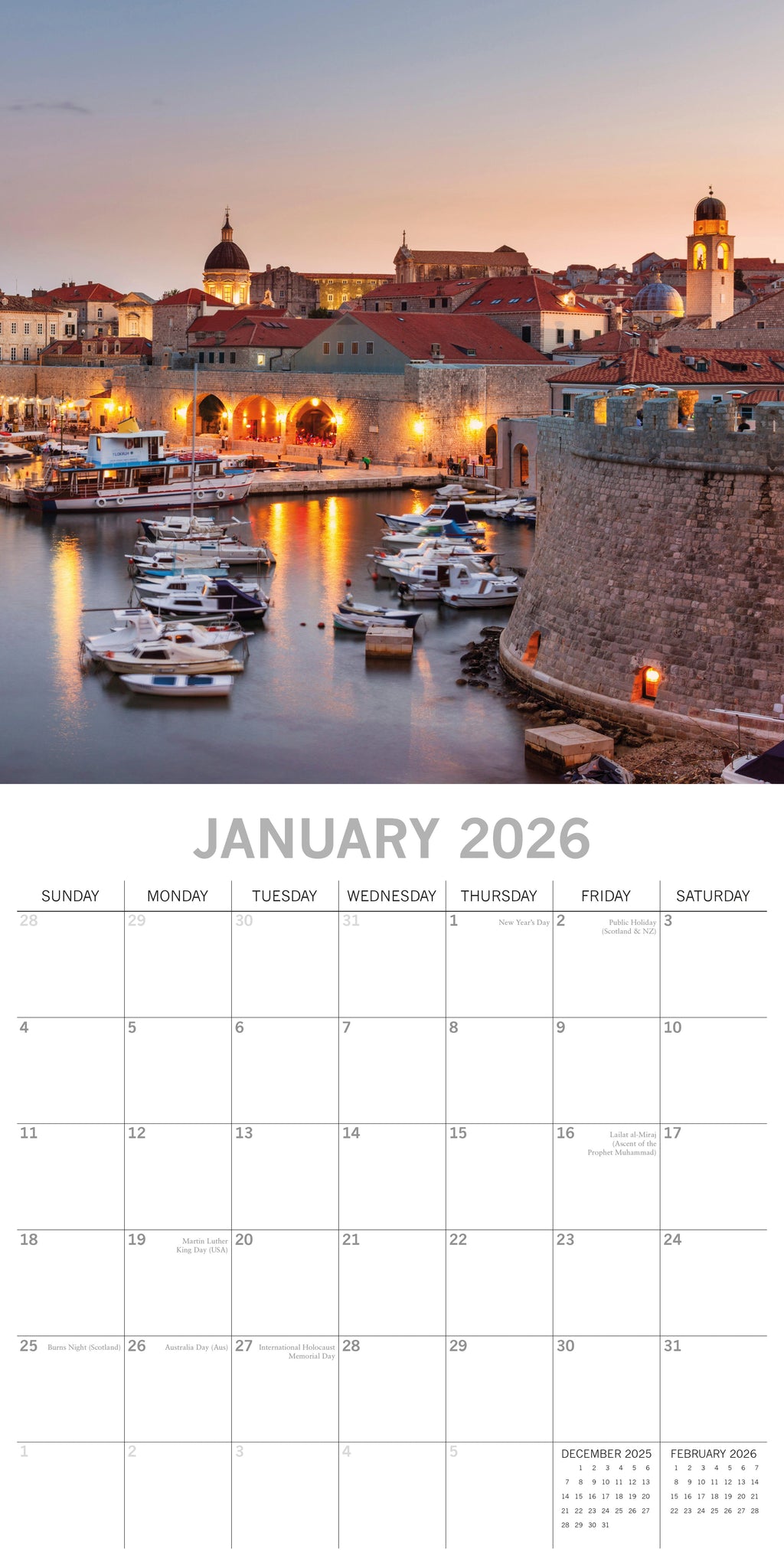 The 2026 Croatia Square Wall Calendar spans 16 months—from September 2025 through December 2026—with the final four months of 2025 presented in a compact, mini-grid format. Each monthly spread begins on Sunday, with the top half showcasing a beautiful image and the bottom half featuring an easy-to-read monthly layout. The calendar comes shrink-wrapped for protection. .