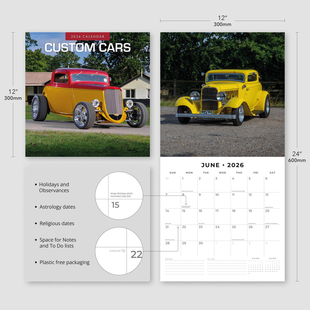 Packaged in a 100% plastic-free, sustainable, FSC-certified envelope, this 2026 Custom Cars Square Wall Calendar from Red Robin Publishing Ltd includes 12 months plus 4 bonus months, providing extended planning and a full year of enjoyment. .