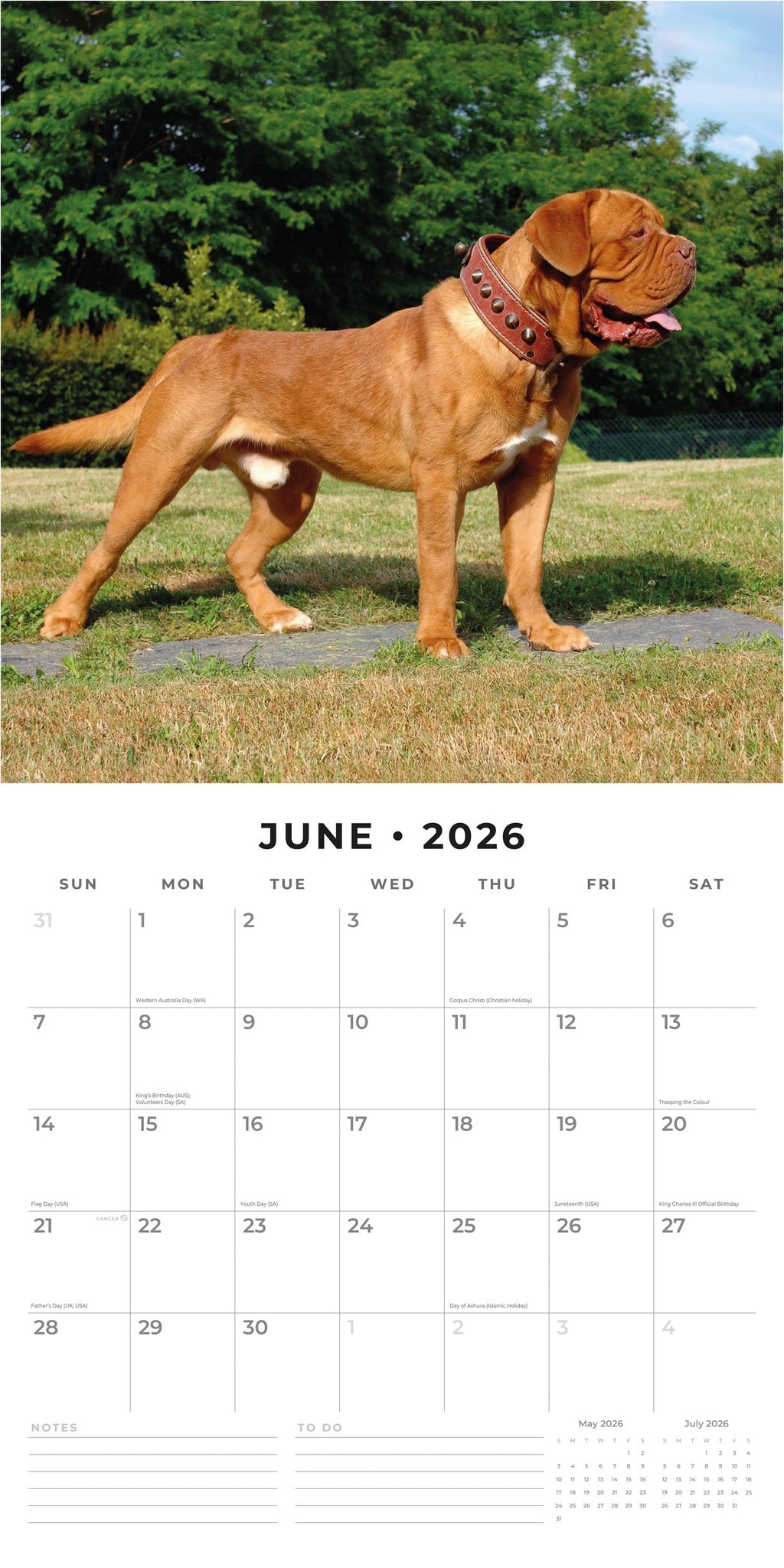 Packaged in a 100% plastic-free, sustainable, FSC-certified envelope, this 2026 Dogues de Bordeaux Square Wall Calendar from Red Robin Publishing Ltd includes 12 months plus 4 bonus months, providing extended planning and a full year of enjoyment. .