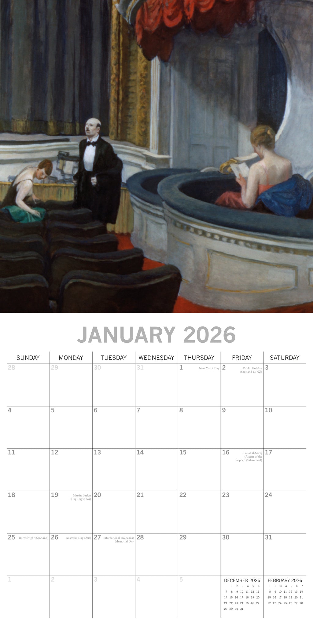 The 2026 Edward Hopper Square Wall Calendar spans 16 months—from September 2025 through December 2026—with the final four months of 2025 presented in a compact, mini-grid format. Each monthly spread begins on Sunday, with the top half showcasing a beautiful image and the bottom half featuring an easy-to-read monthly layout. The calendar comes shrink-wrapped for protection. .