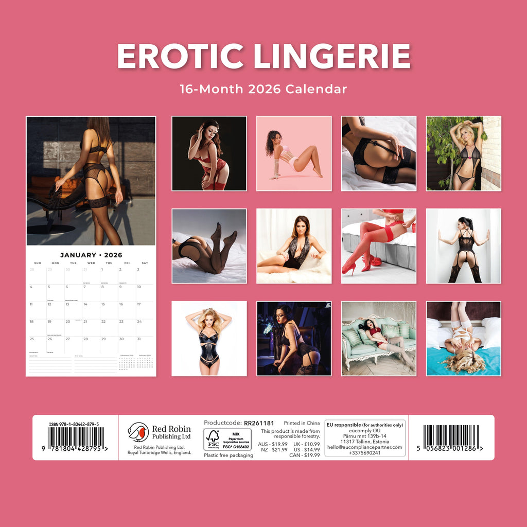 Packaged in a 100% plastic-free, sustainable, FSC-certified envelope, this 2026 Erotic Lingerie Square Wall Calendar from Red Robin Publishing Ltd includes 12 months plus 4 bonus months, providing extended planning and a full year of enjoyment. .