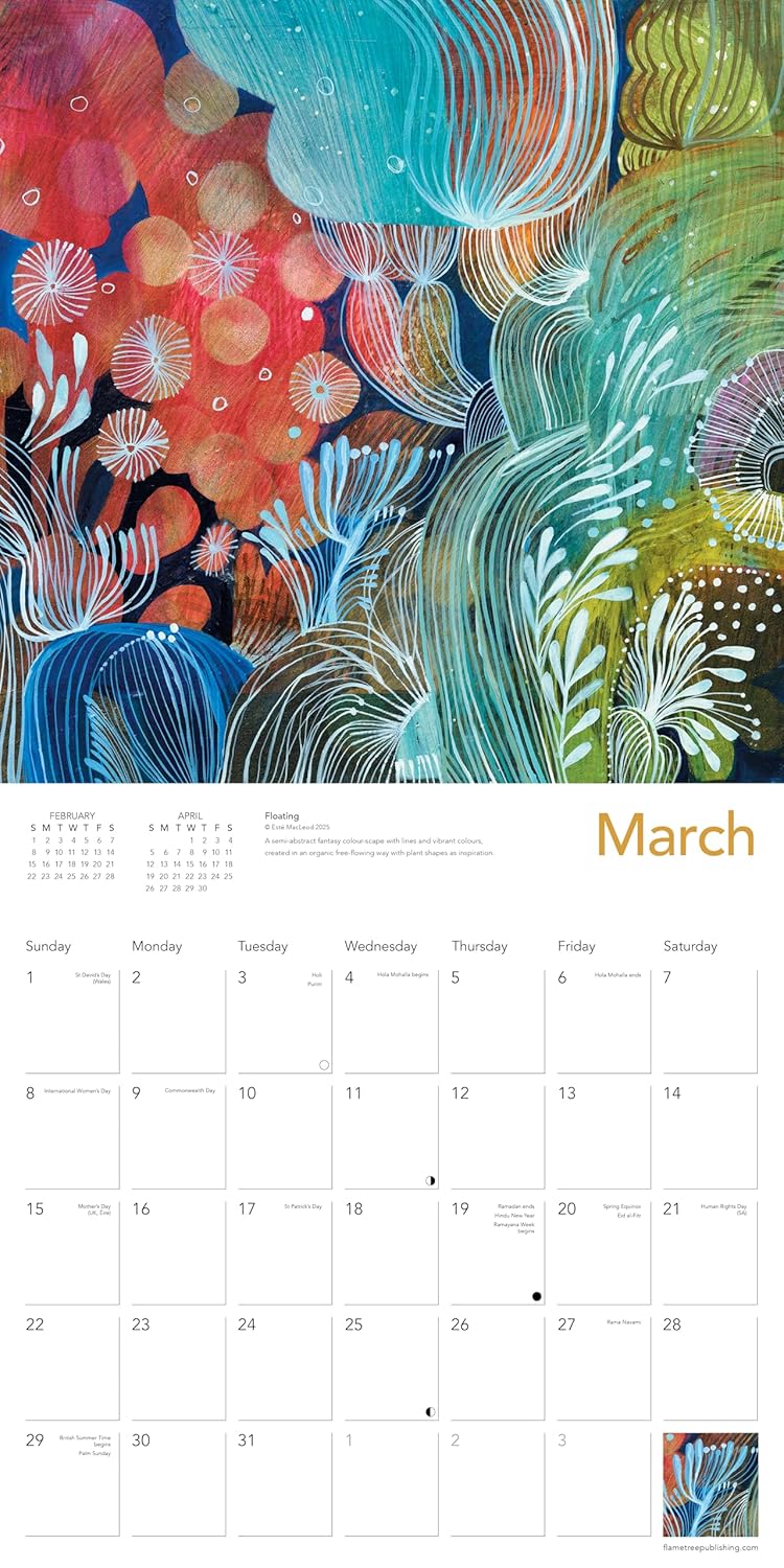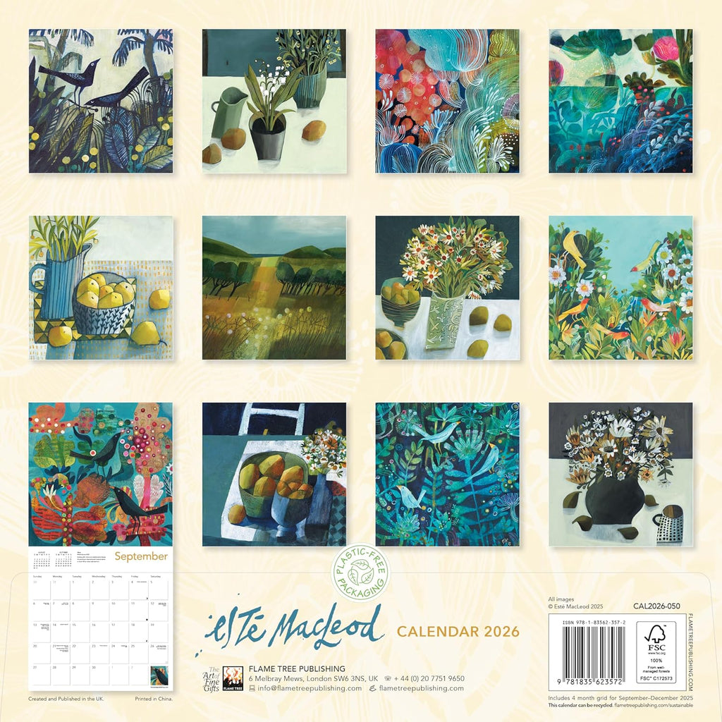Esté MacLeod’s paintings are informed by the real and the imaginary. The variety of techniques Esté uses to layer colour and shapes adds an ethereal element to her work and this wonderful wall calendar brings together a vibrant selection of 12 of her artworks. Her background in textile and ceramic design is noticeable in the stylised, abundant and colourful forms used in her paintings. The datepad features previous and next month’s views. Printed on FSC-certified paper, with plastic-free packaging.