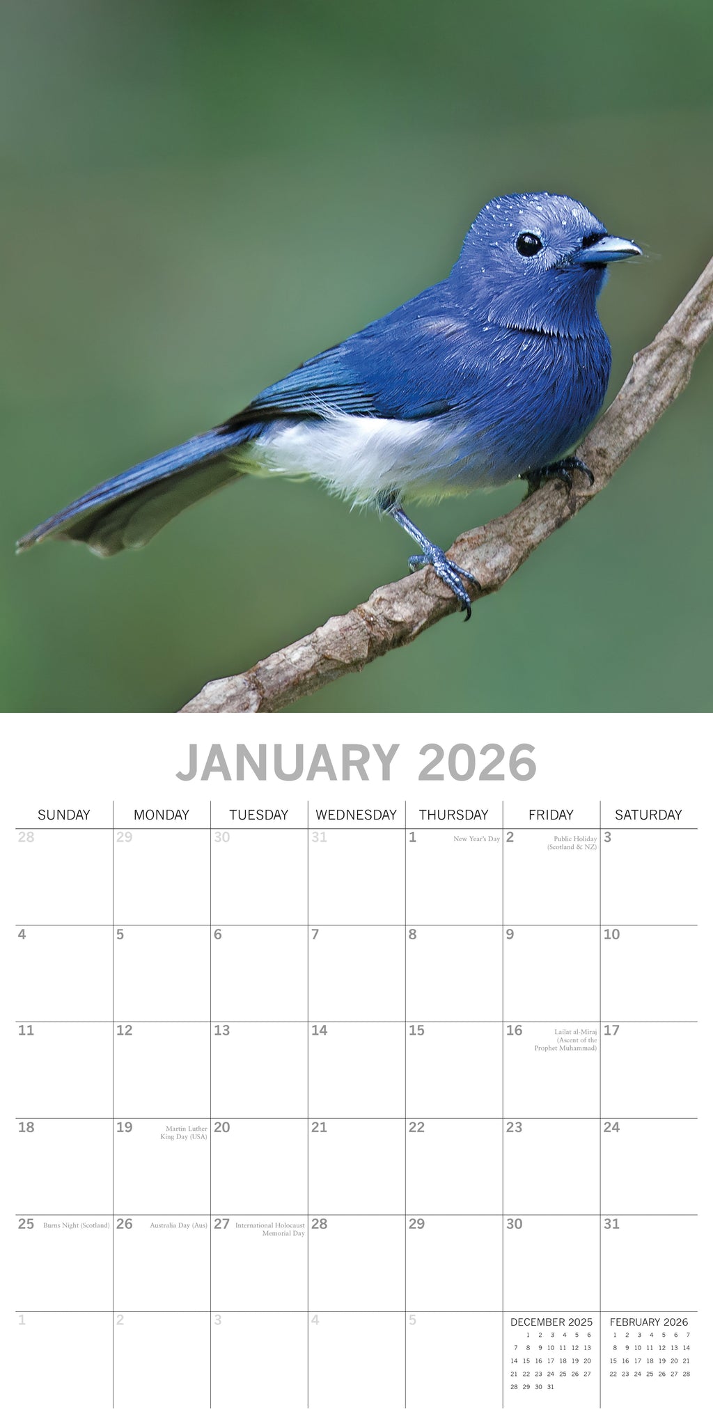 The 2026 Exotic Birds Square Wall Calendar spans 16 months—from September 2025 through December 2026—with the final four months of 2025 presented in a compact, mini-grid format. Each monthly spread begins on Sunday, with the top half showcasing a beautiful image and the bottom half featuring an easy-to-read monthly layout. The calendar comes shrink-wrapped for protection. .