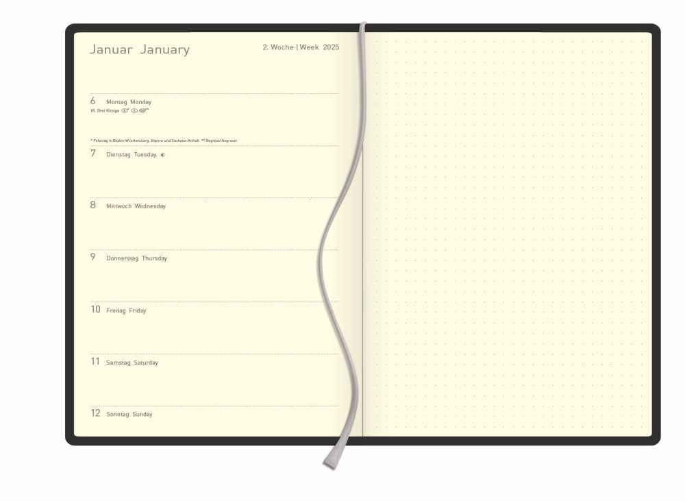 - Format is 7 day diary on left hand page, notes on right hand page