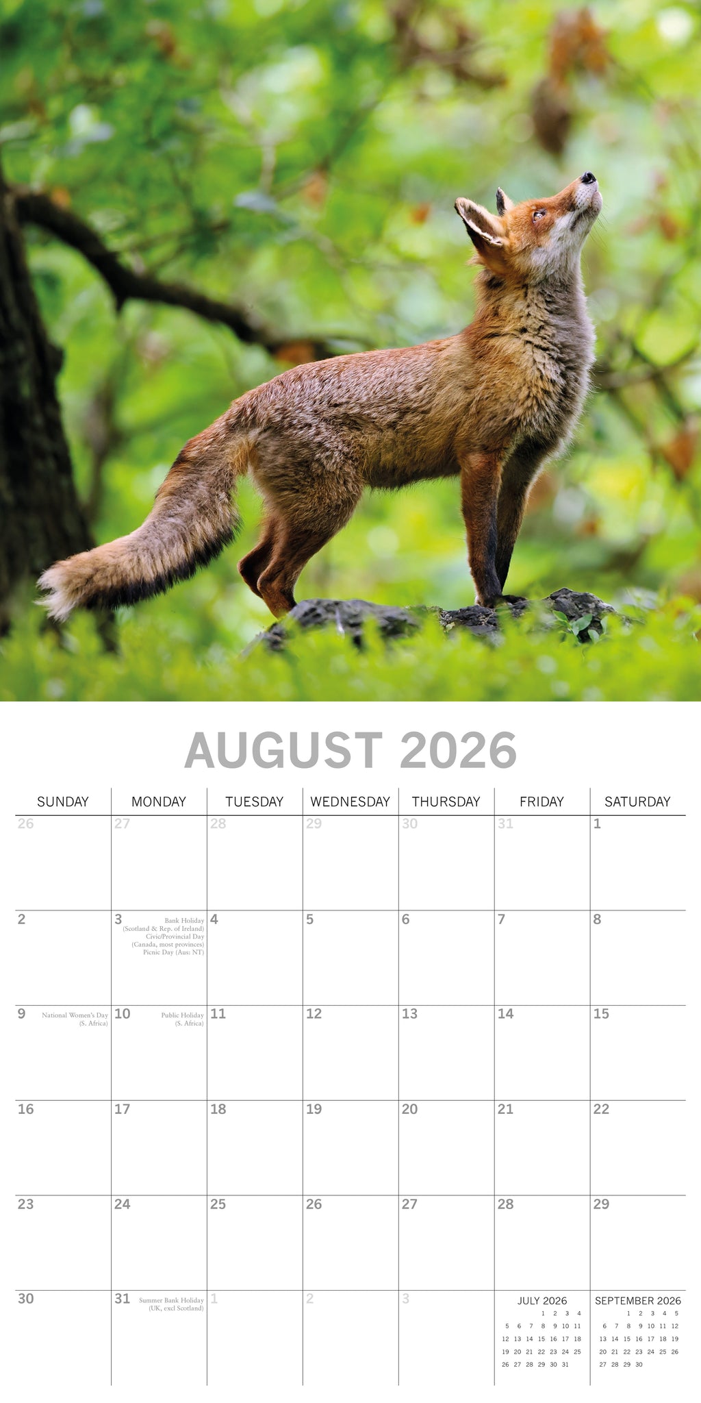 The 2026 Foxes Square Wall Calendar spans 16 months—from September 2025 through December 2026—with the final four months of 2025 presented in a compact, mini-grid format. Each monthly spread begins on Sunday, with the top half showcasing a beautiful image and the bottom half featuring an easy-to-read monthly layout. The calendar comes shrink-wrapped for protection. .