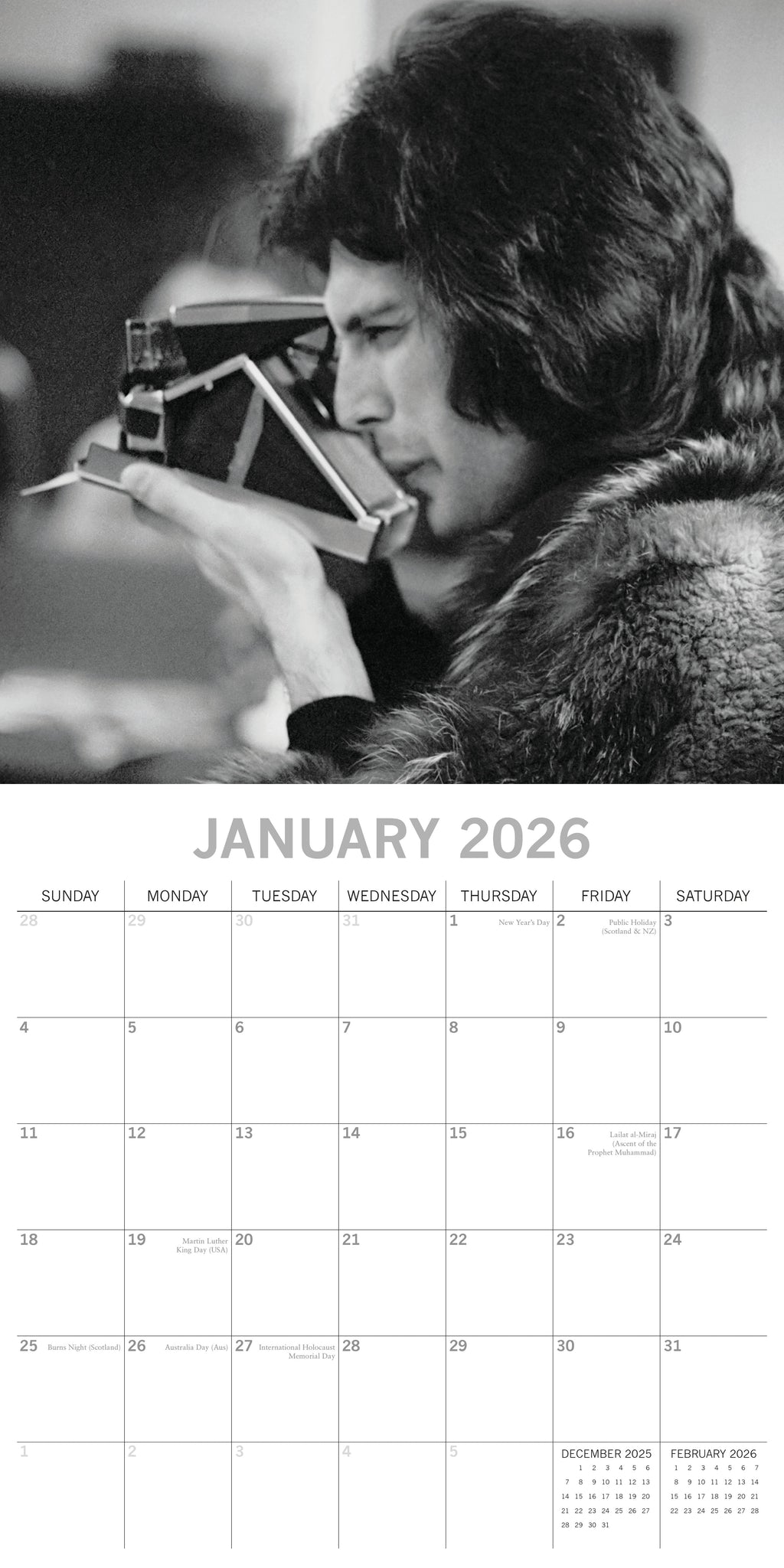 The 2026 Freddie Mercury Square Wall Calendar spans 16 months—from September 2025 through December 2026—with the final four months of 2025 presented in a compact, mini-grid format. Each monthly spread begins on Sunday, with the top half showcasing a beautiful image and the bottom half featuring an easy-to-read monthly layout. The calendar comes shrink-wrapped for protection. .
