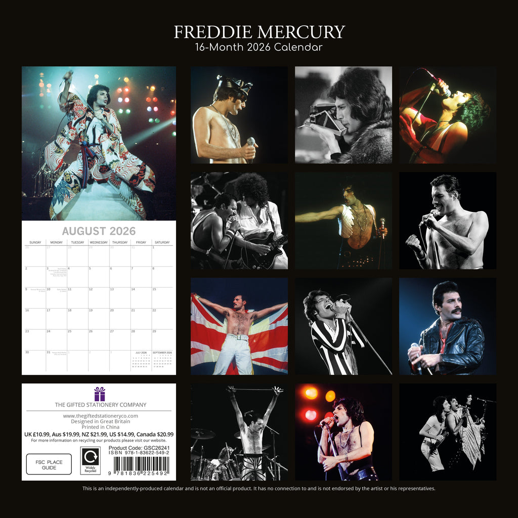 This exquisitely designed 2026 Freddie Mercury Square Wall Calendar from The Gifted Stationery Co. is ideal for your home or office and makes a thoughtful holiday gift for your loved ones. It features 13 stunning images of Freddie Mercury and includes large date grids for jotting down appointments, birthdays, and other important events. When opened, it measures 30 x 60 cm.