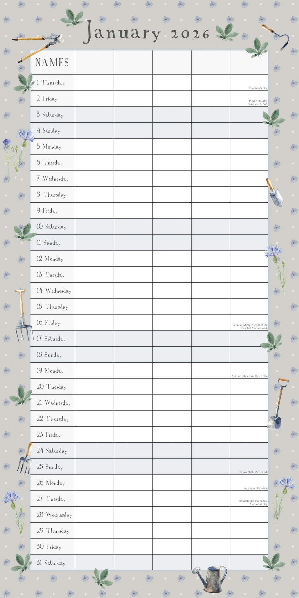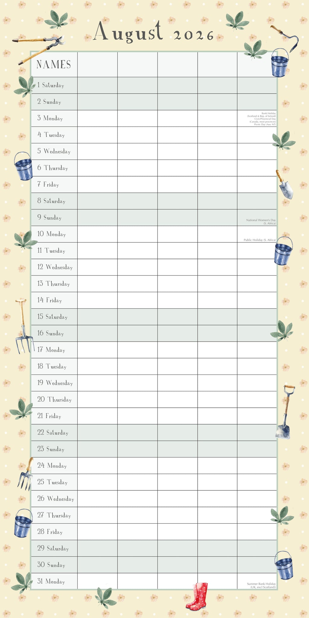 This exquisitely designed 2026 Garden Organiser Square Wall Calendar from The Gifted Stationery Co. is ideal for your home or office and makes a thoughtful holiday gift for your loved ones. It features 13 stunning images of Garden Organiser and includes large date grids for jotting down appointments, birthdays, and other important events. When opened, it measures 30 x 60 cm.