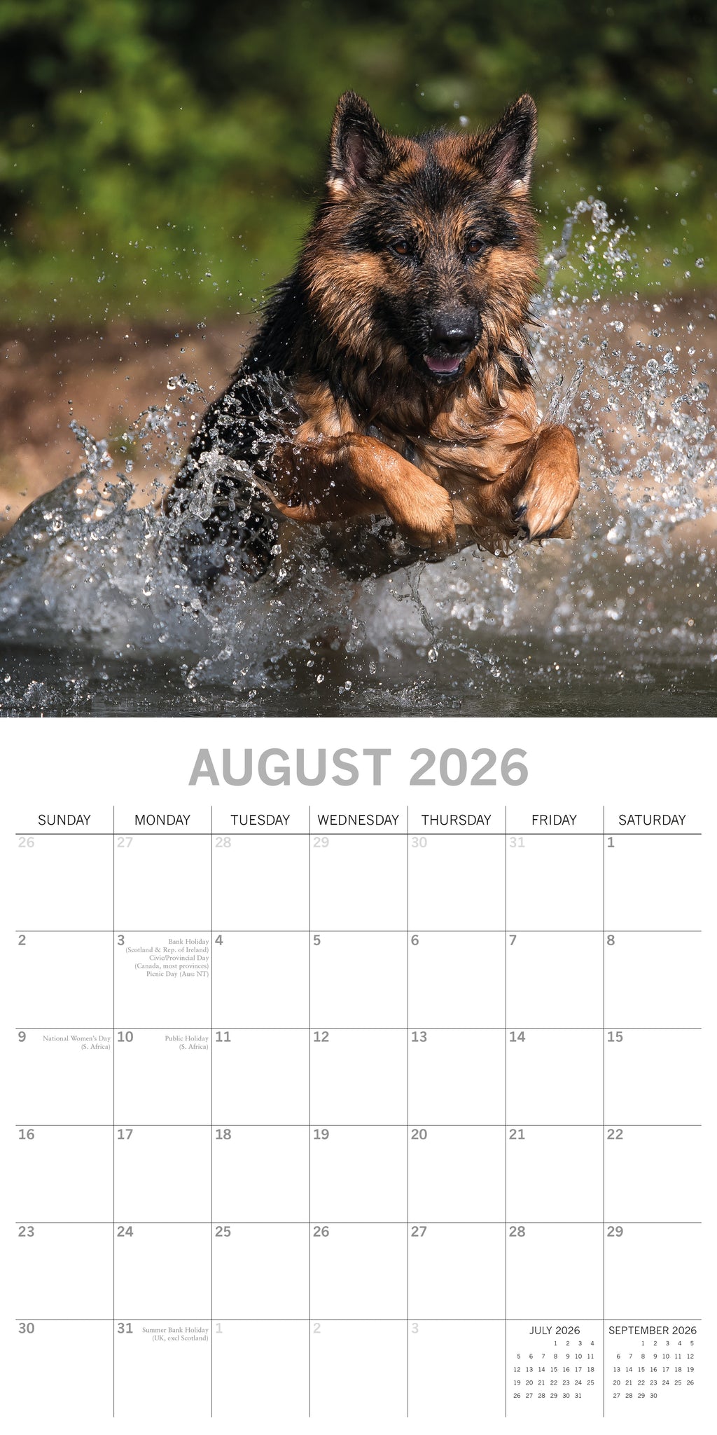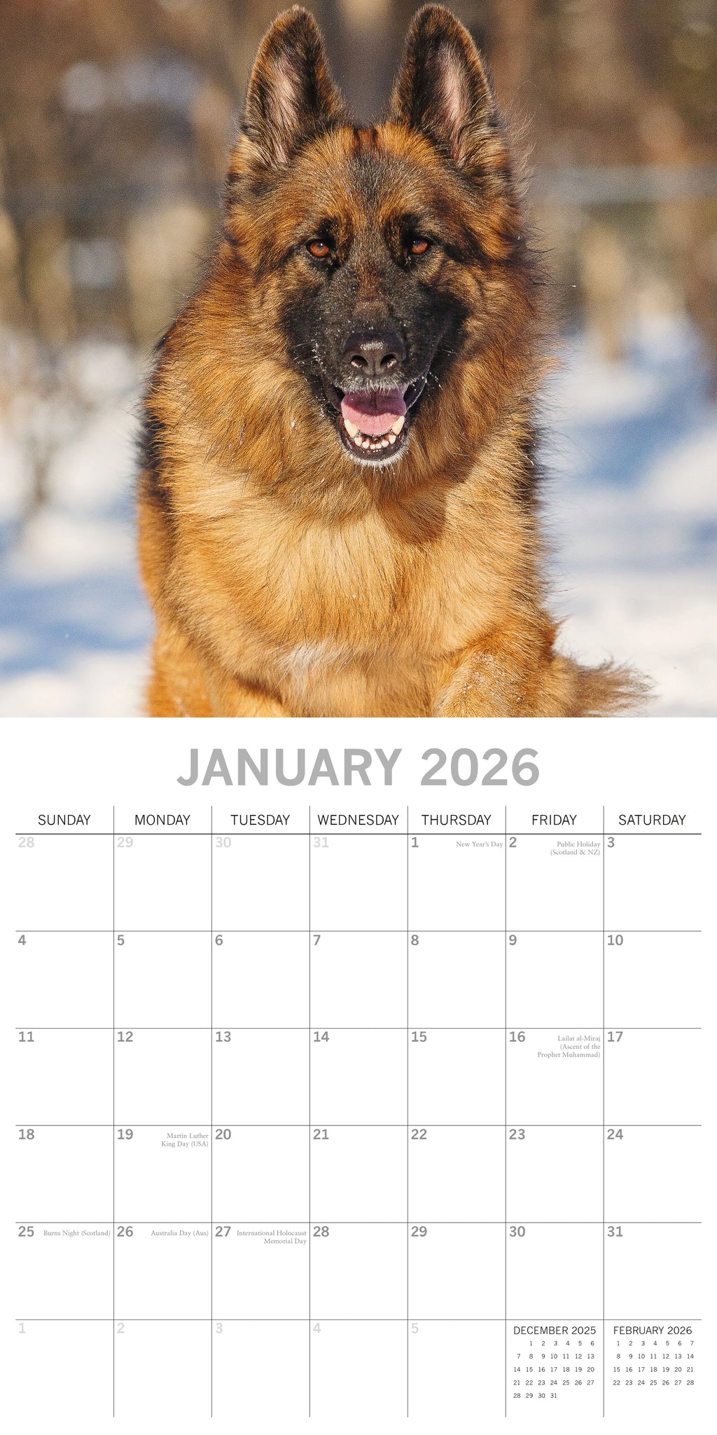 The 2026 German Shepherds Square Wall Calendar spans 16 months—from September 2025 through December 2026—with the final four months of 2025 presented in a compact, mini-grid format. Each monthly spread begins on Sunday, with the top half showcasing a beautiful image and the bottom half featuring an easy-to-read monthly layout. The calendar comes shrink-wrapped for protection. .