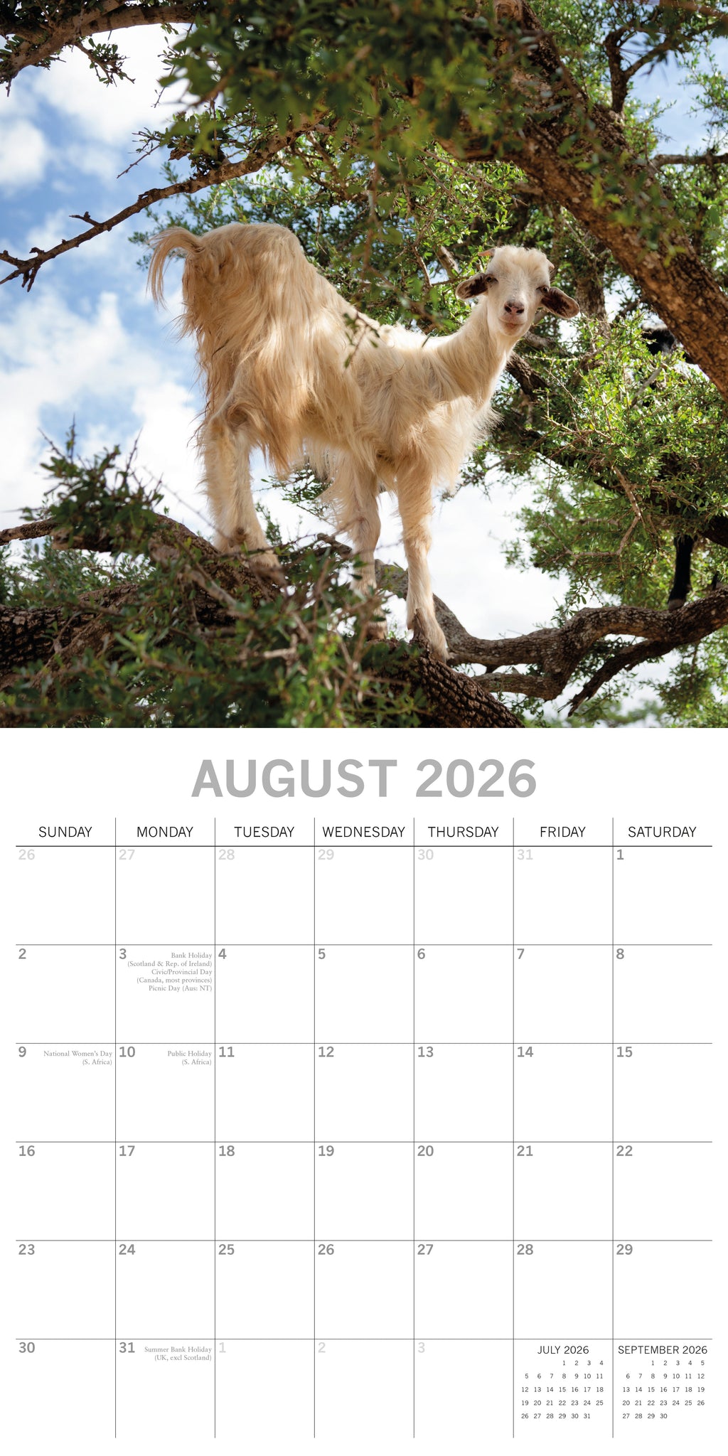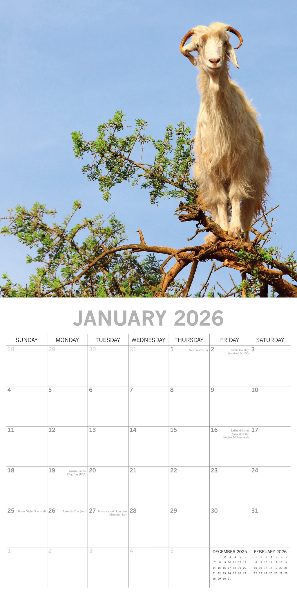 This exquisitely designed 2026 Goats in Trees Square Wall Calendar from The Gifted Stationery Co. is ideal for your home or office and makes a thoughtful holiday gift for your loved ones. It features 13 stunning images of Goats in Trees and includes large date grids for jotting down appointments, birthdays, and other important events. When opened, it measures 30 x 60 cm.