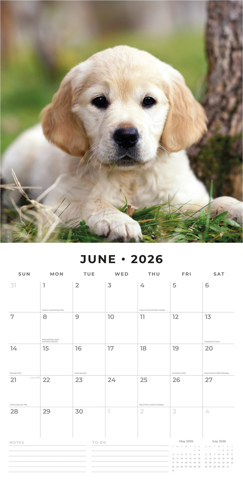 Packaged in a 100% plastic-free, sustainable, FSC-certified envelope, this 2026 Golden Retriever Puppies Square Wall Calendar from Red Robin Publishing Ltd includes 12 months plus 4 bonus months, providing extended planning and a full year of enjoyment. .