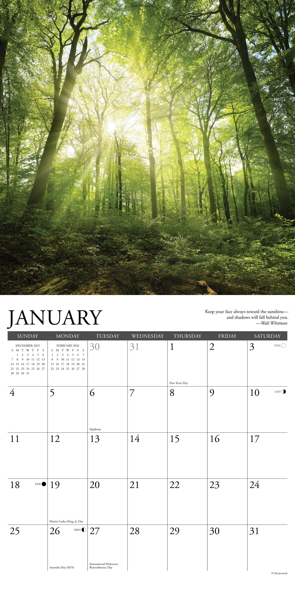 • BONUS FEATURES –US and International holidays and moon phases (CST) noted on each month for easy tracking