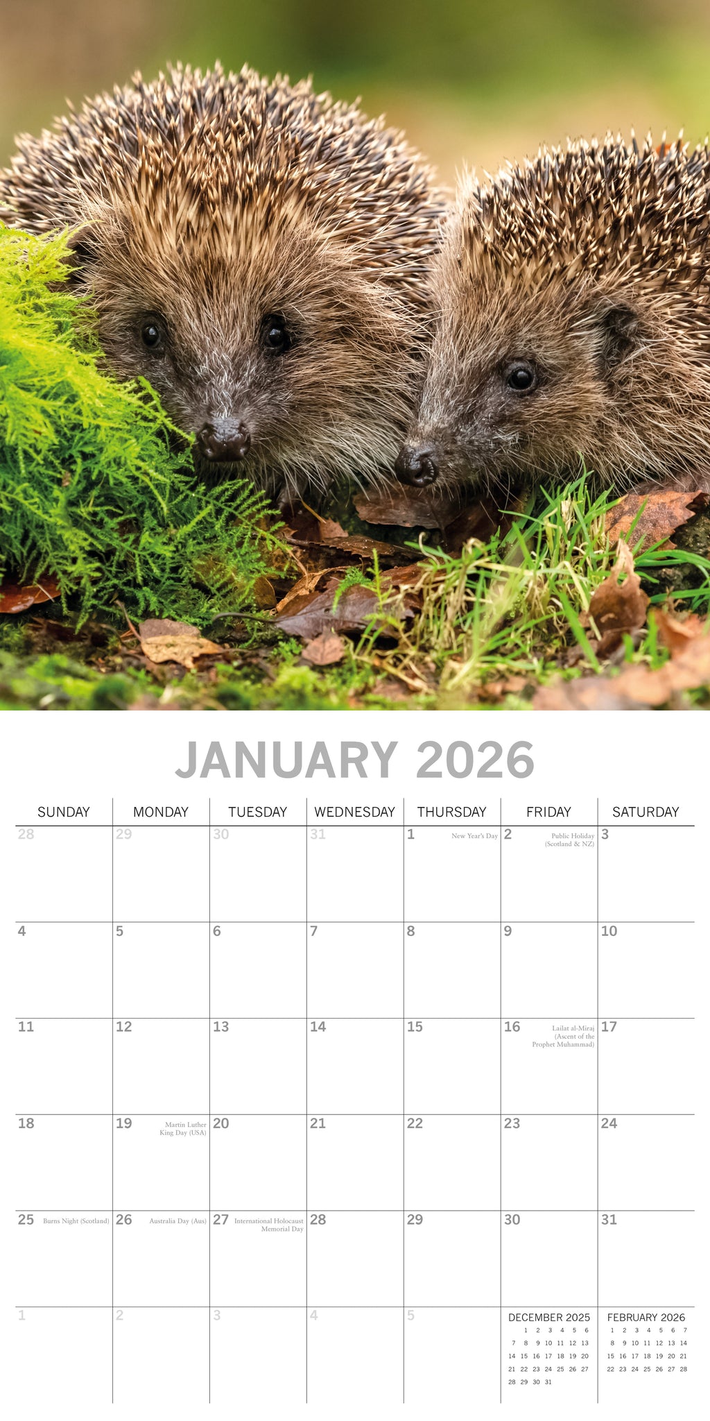 The 2026 Hedgehogs Square Wall Calendar spans 16 months—from September 2025 through December 2026—with the final four months of 2025 presented in a compact, mini-grid format. Each monthly spread begins on Sunday, with the top half showcasing a beautiful image and the bottom half featuring an easy-to-read monthly layout. The calendar comes shrink-wrapped for protection. .