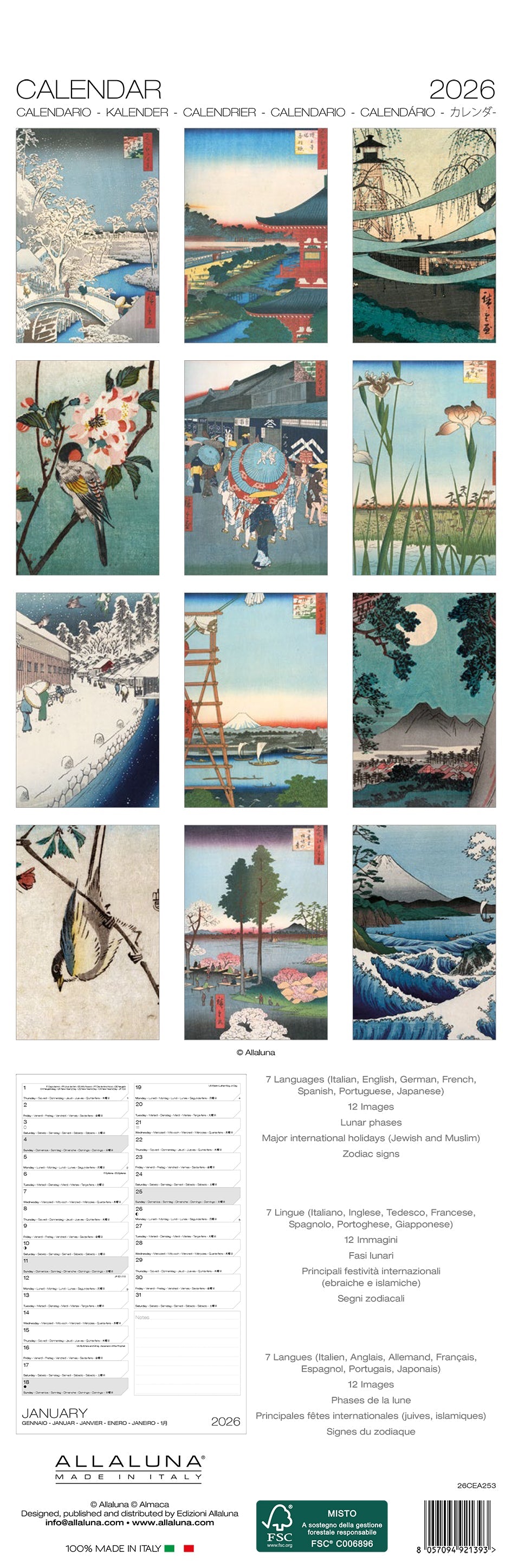 Elegant long wall calendar, made in Italy by Allaluna