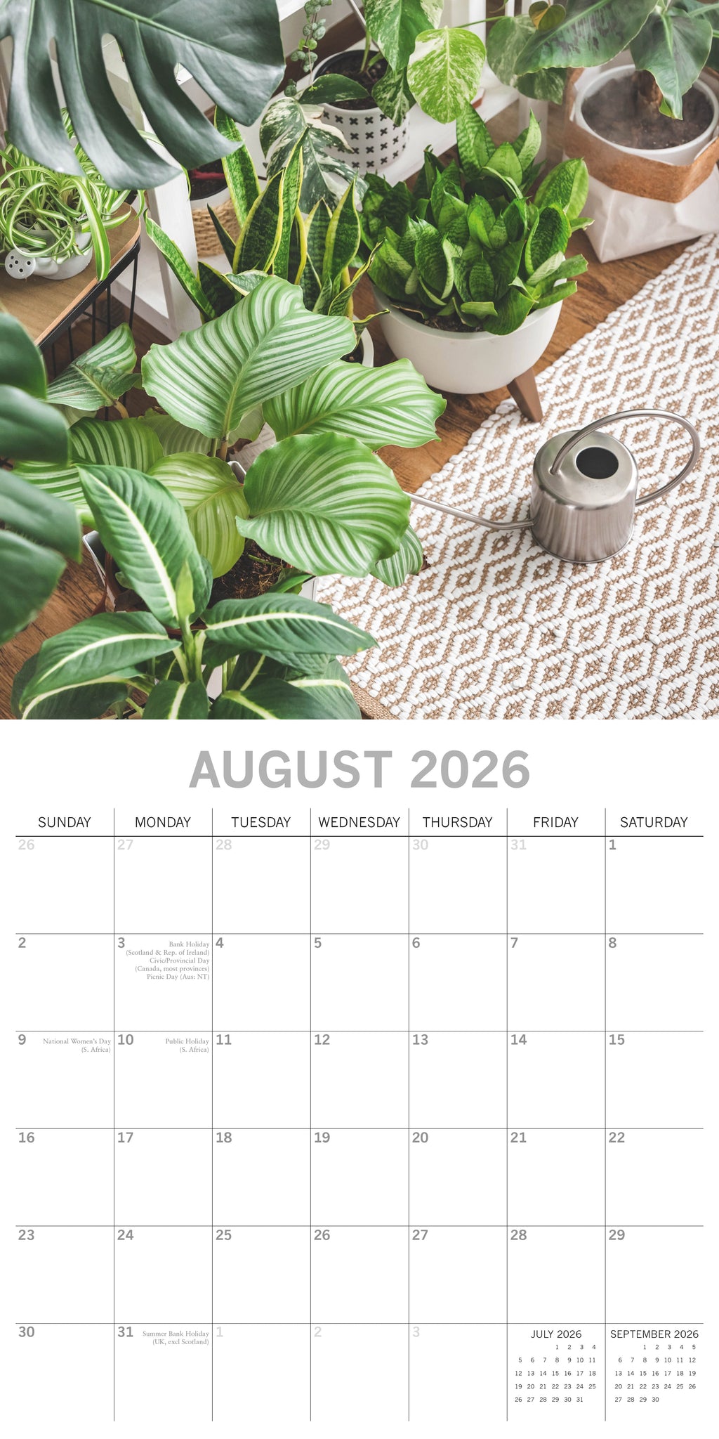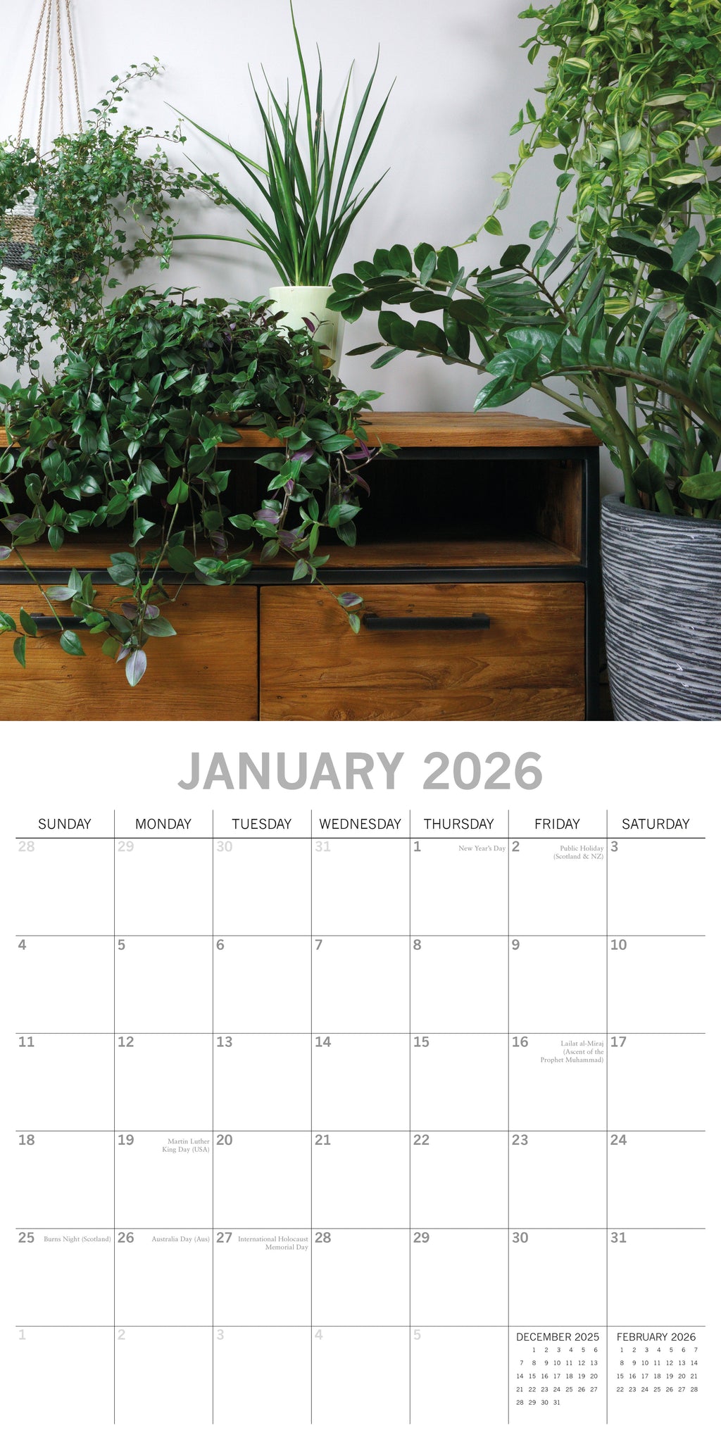 The 2026 House Plants Square Wall Calendar spans 16 months—from September 2025 through December 2026—with the final four months of 2025 presented in a compact, mini-grid format. Each monthly spread begins on Sunday, with the top half showcasing a beautiful image and the bottom half featuring an easy-to-read monthly layout. The calendar comes shrink-wrapped for protection. .