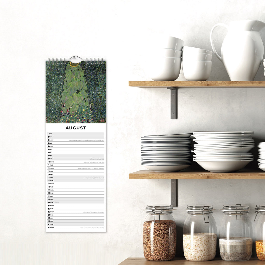 Explore the year ahead with our exquisite 2026 Klimt - Slim Wall Calendar, showcasing 12 stunning 41 x 15 cm images—one for each month. With its sleek vertical format, this calendar brings a stylish and space-saving touch to any wall, while highlighting the beauty of Klimt throughout the year.