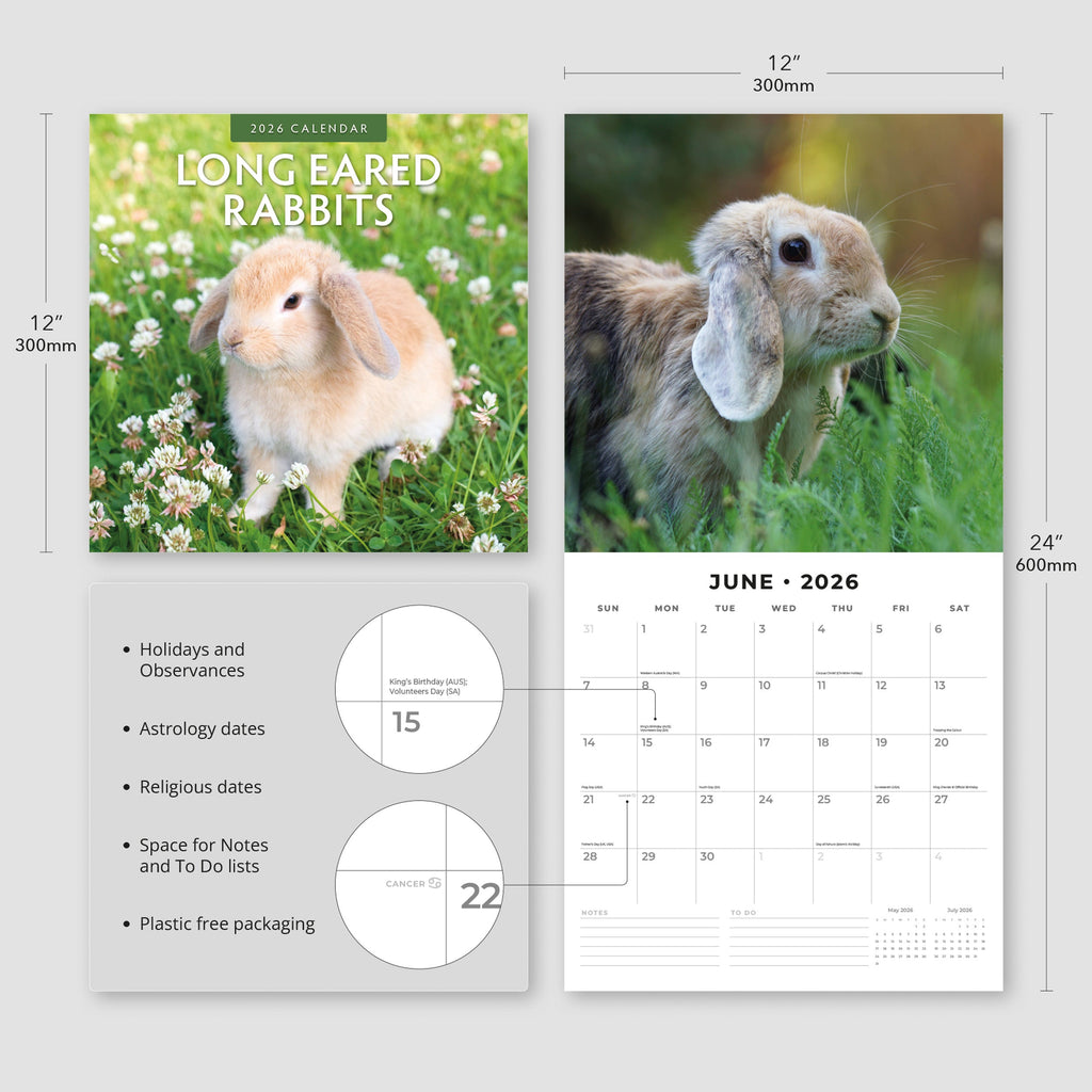Step into the year ahead with our exquisite 2026 Long Eared Rabbits - Square Wall Calendar, featuring 12 stunning 30 x 30 cm photos of long eared rabbits—one for each month. Each image captures the essence of the theme, bringing beauty and inspiration to your space all year long.