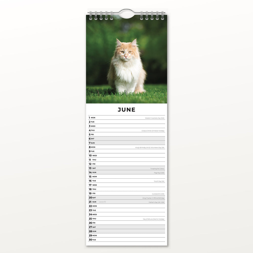 Explore the year ahead with our exquisite 2026 Maine Coon Cats - Slim Wall Calendar, showcasing 12 stunning 41 x 15 cm images—one for each month. With its sleek vertical format, this calendar brings a stylish and space-saving touch to any wall, while highlighting the beauty of Maine Coon Cats throughout the year.