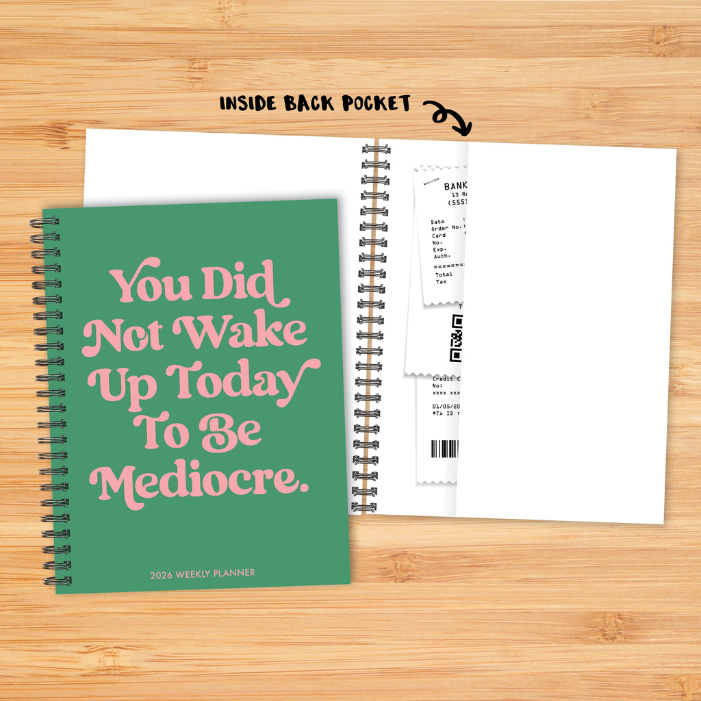 Embrace the humor of everyday life with this spiral weekly planner, featuring a lyric-inspired 'Mediocre' design and plenty of space for your schedules, notes, and to-dos. Featuring a soft cover and spiral binding, it's the ideal companion for success from January to December 2026.