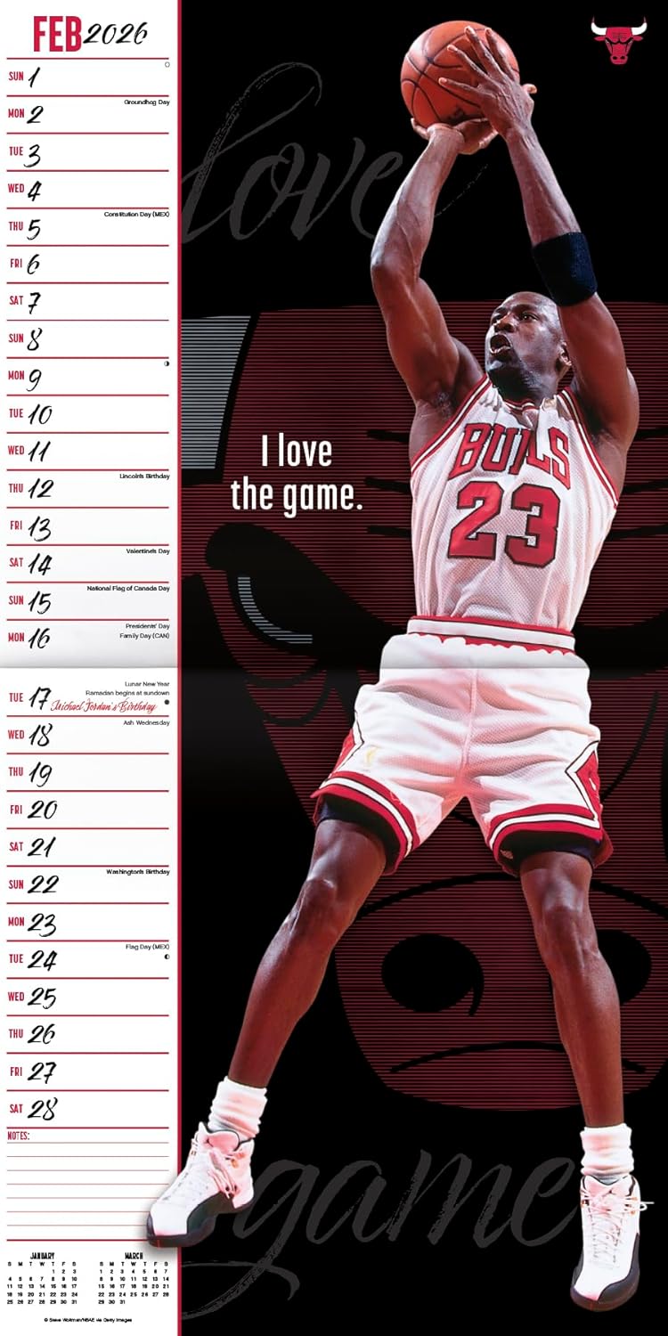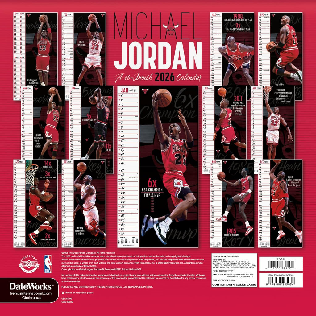 There are no shortcuts in life! Michael Jordan of the Chicago Bulls worked hard for all of his successes: 15 years in the NBA and six national championship rings. Turn your perceived weaknesses into strengths with Michael’s advice and images from his illustrious career on the court in the 2026 Michael Jordan Calendar. Sixteen-month wall calendars feature monthly pages for January to December 2026, as well as a page combining the last four months of 2025. Each monthly page includes federal holidays and moon phases, with sufficient daily blocks for jotting down tasks and appointments to help you stay organized. Features 13 high-quality images printed on premium paper certified by the Forest Stewardship Council. Perfect for hanging on your wall, corkboard or bulletin board at home, school or the office.