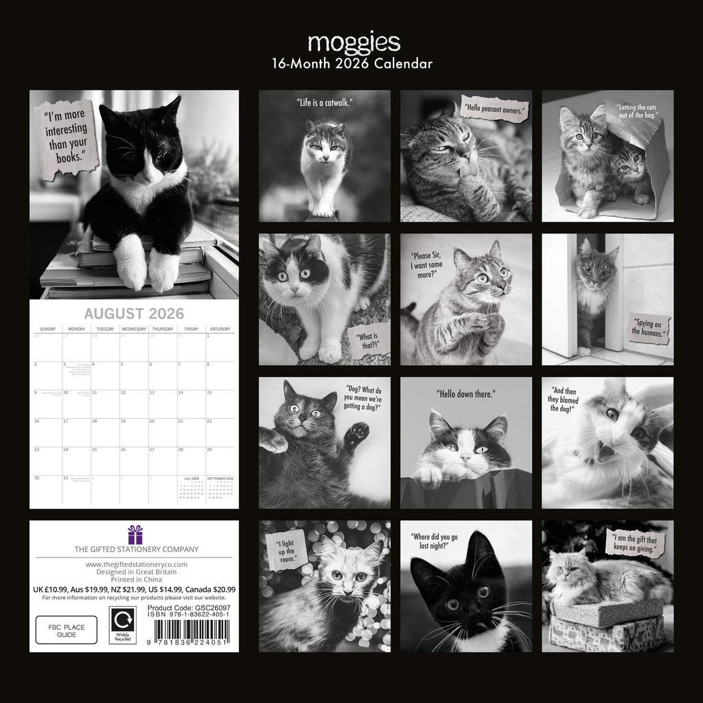 The 2026 Moggies Square Wall Calendar spans 16 months—from September 2025 through December 2026—with the final four months of 2025 presented in a compact, mini-grid format. Each monthly spread begins on Sunday, with the top half showcasing a beautiful image and the bottom half featuring an easy-to-read monthly layout. The calendar comes shrink-wrapped for protection. .