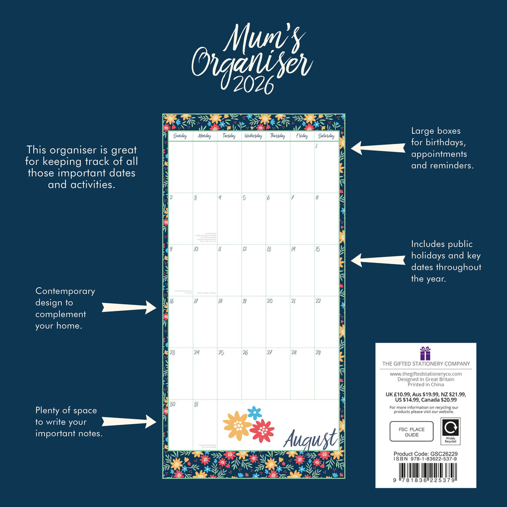 This exquisitely designed 2026 Mum's Organiser Square Wall Calendar from The Gifted Stationery Co. is ideal for your home or office and makes a thoughtful holiday gift for your loved ones. It features 13 stunning images of Mum's Organiser and includes large date grids for jotting down appointments, birthdays, and other important events. When opened, it measures 30 x 60 cm.