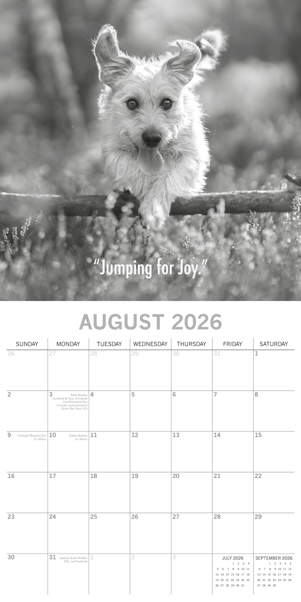 The 2026 Mutts Square Wall Calendar spans 16 months—from September 2025 through December 2026—with the final four months of 2025 presented in a compact, mini-grid format. Each monthly spread begins on Sunday, with the top half showcasing a beautiful image and the bottom half featuring an easy-to-read monthly layout. The calendar comes shrink-wrapped for protection. .