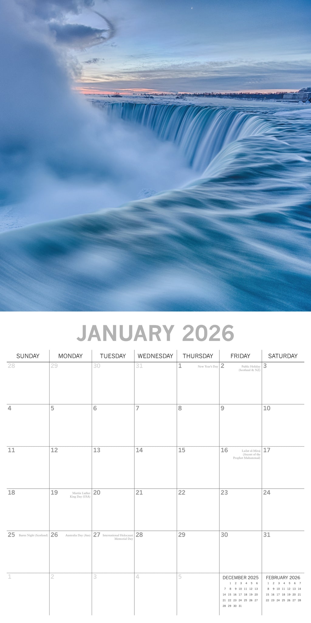 The 2026 Natural Wonders Square Wall Calendar spans 16 months—from September 2025 through December 2026—with the final four months of 2025 presented in a compact, mini-grid format. Each monthly spread begins on Sunday, with the top half showcasing a beautiful image and the bottom half featuring an easy-to-read monthly layout. The calendar comes shrink-wrapped for protection. .