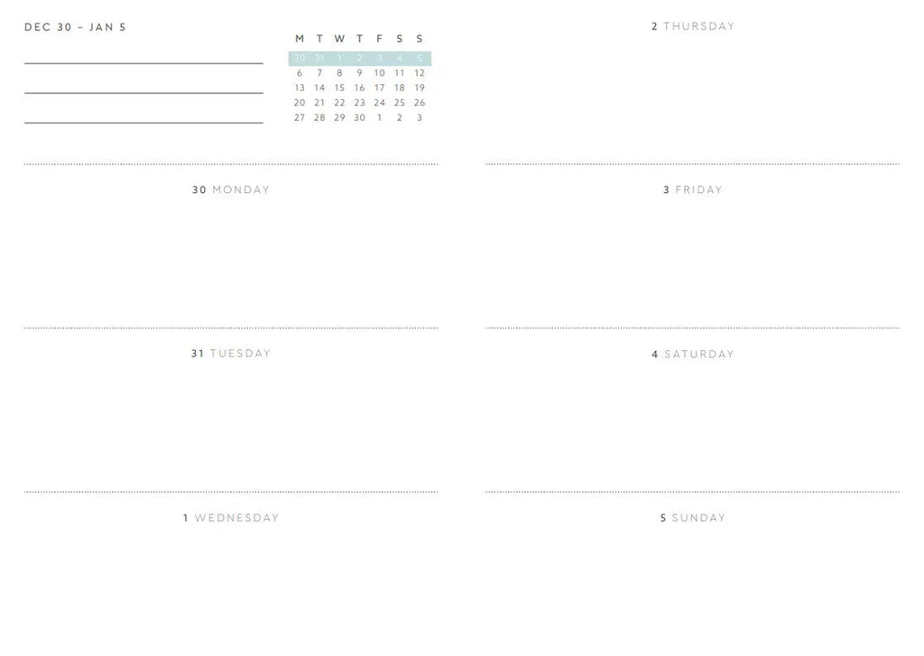 • Year to view, monthly planner, monthly "things of importance" page, monthly budget