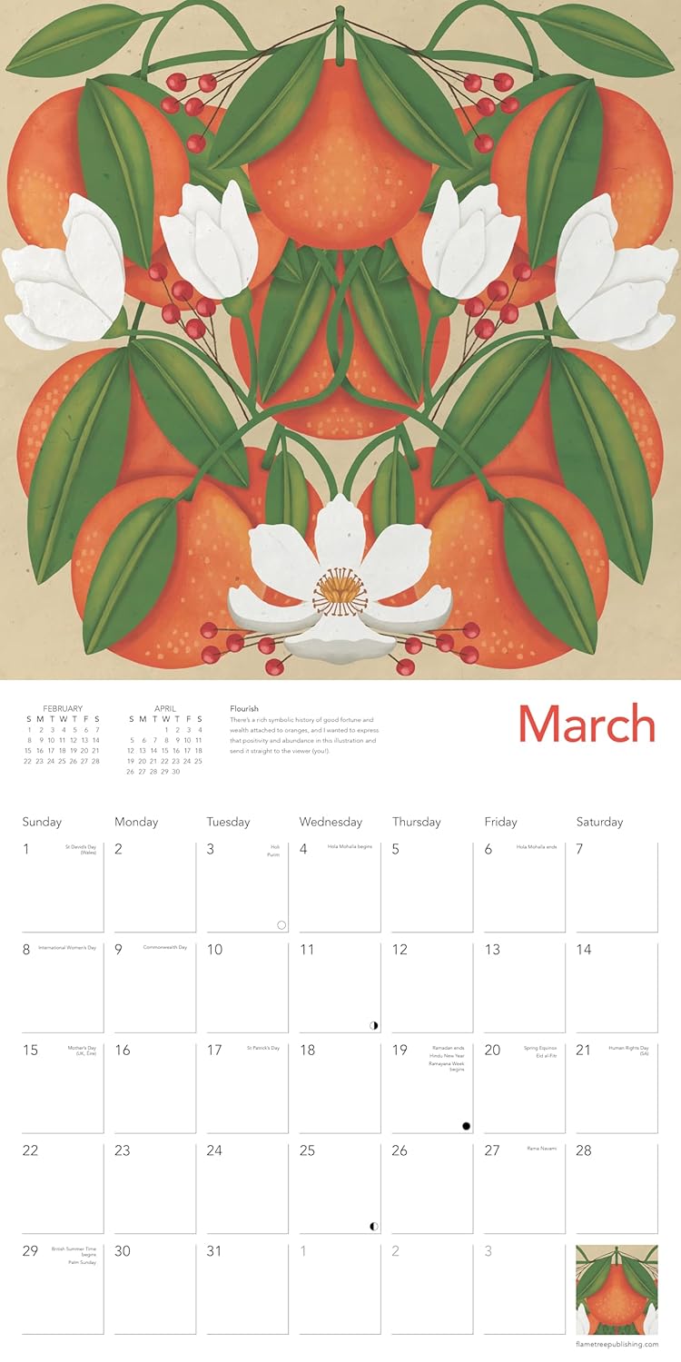 Nina Pace is a painter, illustrator and surface designer based just outside New York City, whose artwork embraces the full and glorious spectrum of hues and patterns embodied in the natural world. She is awestruck by the sheer variety of petal shapes, the detailed patterning and vein layouts. When creating a new piece, Nina takes this inspiration from nature and lets the design build organically. This calendar showcases 12 of her bold and intricate works, accompanied by words from the artist herself. The datepad features previous and next months views in this art calendar. Printed on FSC-certified paper, with plastic-free packaging.