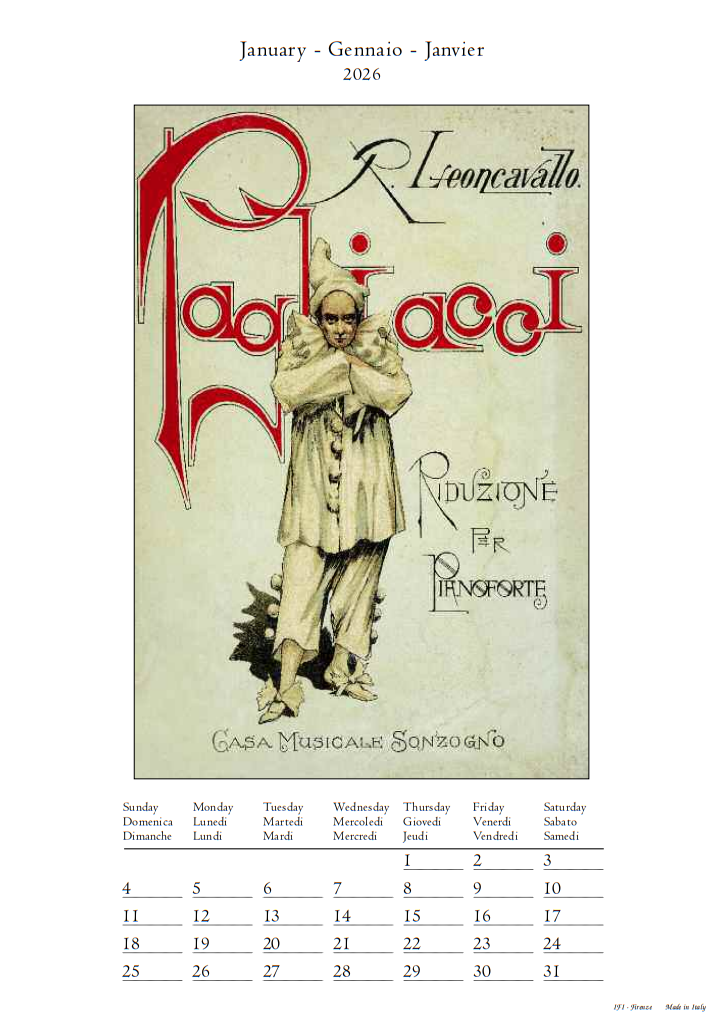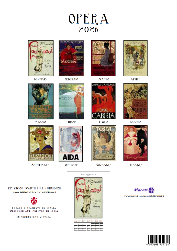 Bring the drama and elegance of the stage into your home with the Istituto Fotocromo Italiano Ð 2026 Opera Art Calendar (24 x 34 cm). Each month showcases vintage-style opera artwork that captures the emotion, beauty, and grandeur of ItalyÕs most iconic performances.