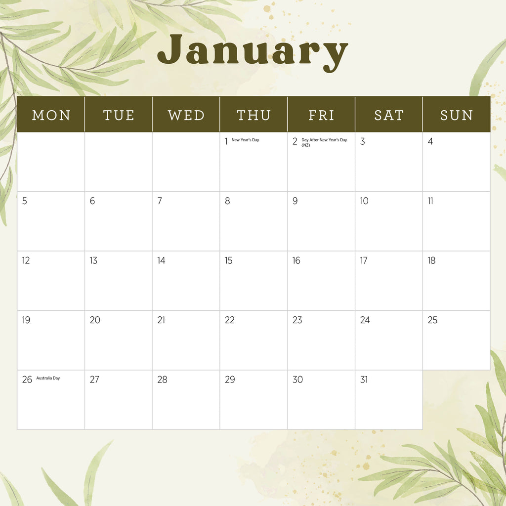This square wall calendar covers 18-Months. Every month of the year from January 2026 to December 2026 is included, with 2027 dates also listed on a separate single-page overview. The size of the wall calendar is 300mm x 600mm when opened. Each week displayed in the calendar begins on a Monday, and all major Public Holidays and 2026 School Term dates for Australian and New Zealand Public Schools are also included. You won’t miss a beat in 2026!