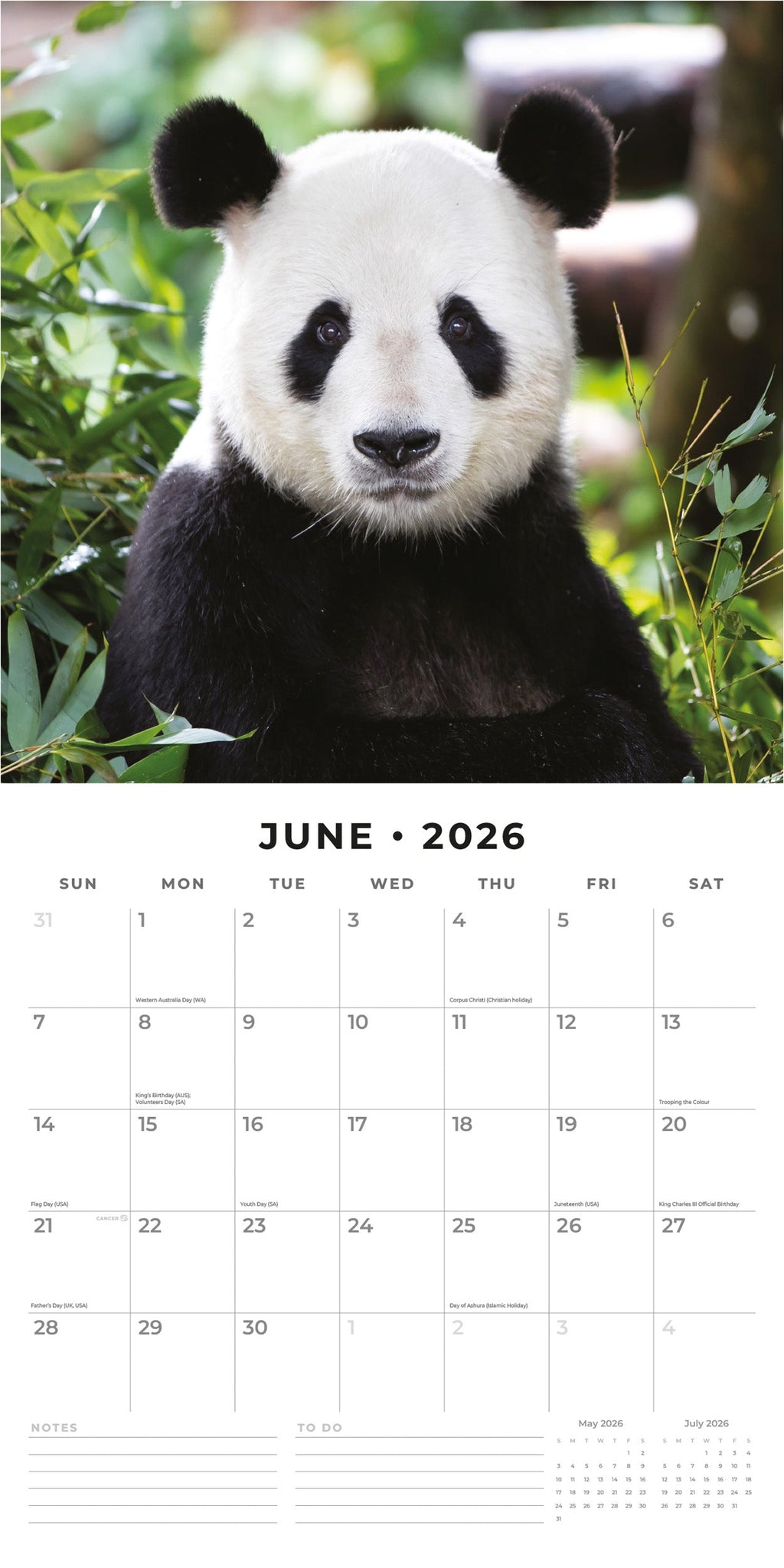 Step into the year ahead with our exquisite 2026 Pandas - Square Wall Calendar, featuring 12 stunning 30 x 30 cm photos of pandas—one for each month. Each image captures the essence of the theme, bringing beauty and inspiration to your space all year long.