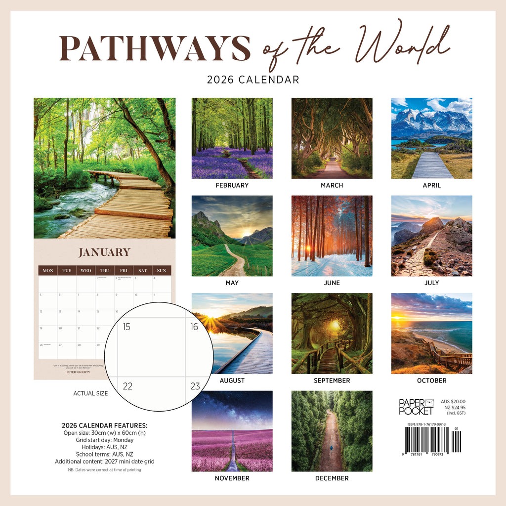 Travel through the stunning pathways of the world's most iconic destinations and explore the beauty of diverse landscapes in this 2026 wall calendar.