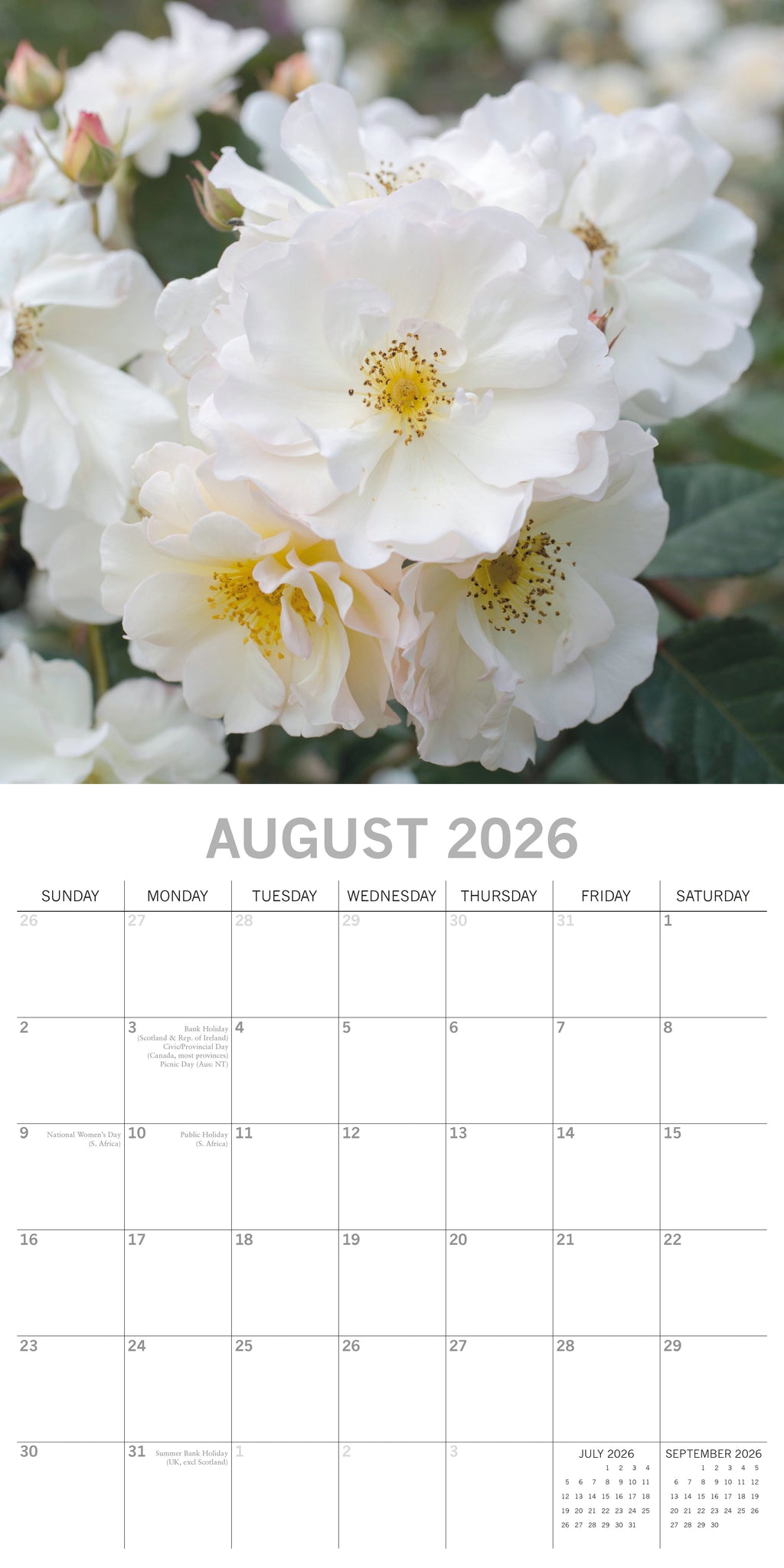 This exquisitely designed 2026 Roses Square Wall Calendar from The Gifted Stationery Co. is ideal for your home or office and makes a thoughtful holiday gift for your loved ones. It features 13 stunning images of Roses and includes large date grids for jotting down appointments, birthdays, and other important events. When opened, it measures 30 x 60 cm.