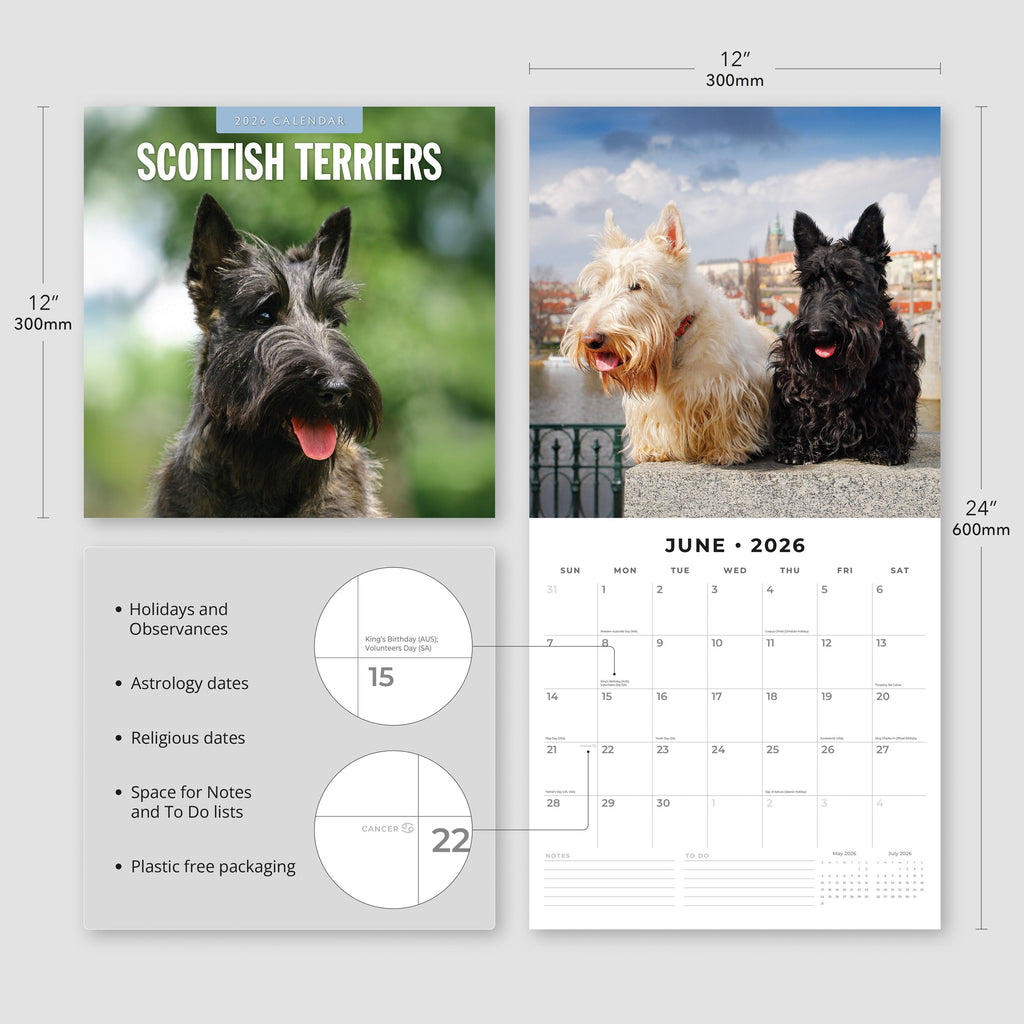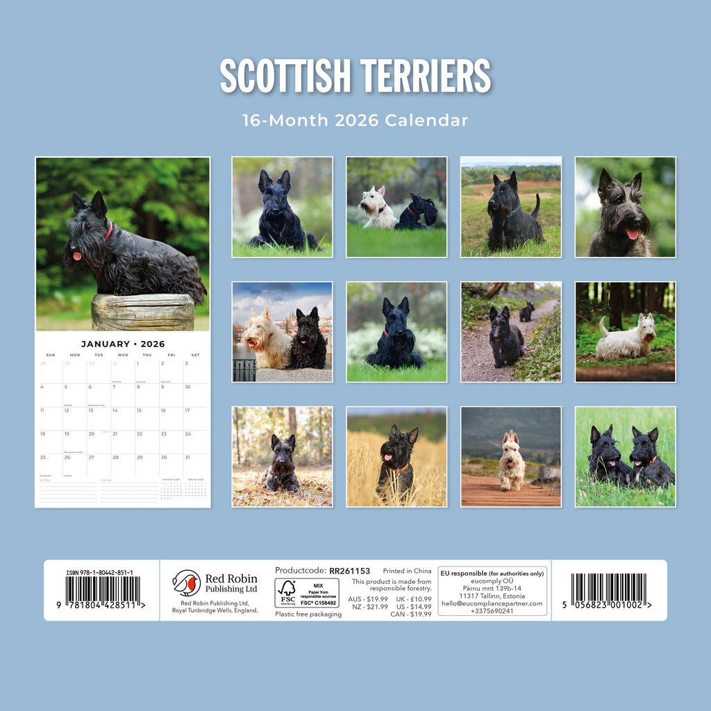 Packaged in a 100% plastic-free, sustainable, FSC-certified envelope, this 2026 Scottish Terriers Square Wall Calendar from Red Robin Publishing Ltd includes 12 months plus 4 bonus months, providing extended planning and a full year of enjoyment. .