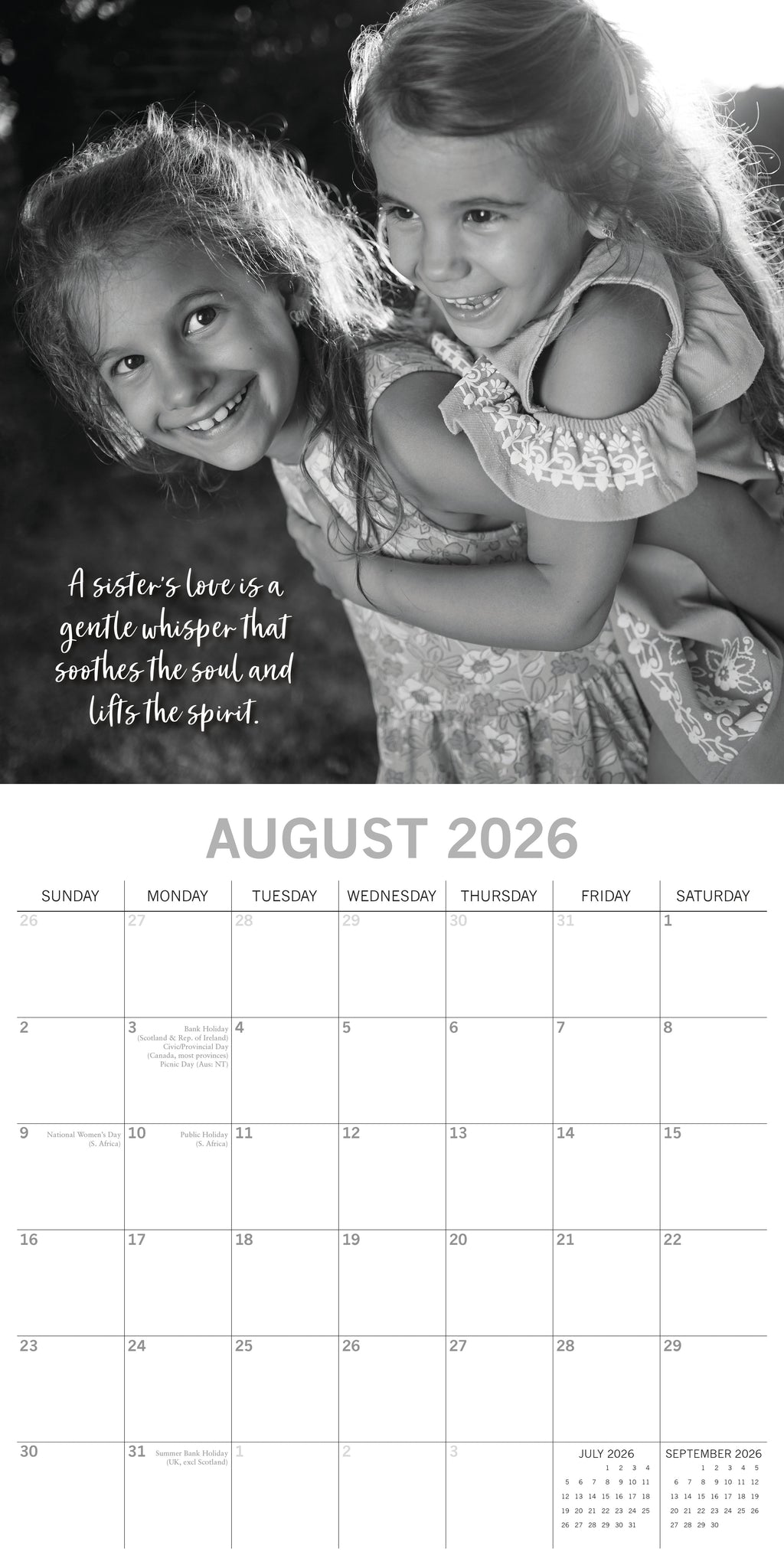 The 2026 Sisters Square Wall Calendar spans 16 months—from September 2025 through December 2026—with the final four months of 2025 presented in a compact, mini-grid format. Each monthly spread begins on Sunday, with the top half showcasing a beautiful image and the bottom half featuring an easy-to-read monthly layout. The calendar comes shrink-wrapped for protection. .