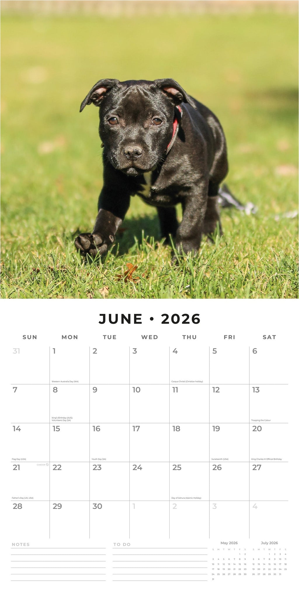 Packaged in a 100% plastic-free, sustainable, FSC-certified envelope, this 2026 Staffordshire Bull Terrier Puppies Square Wall Calendar from Red Robin Publishing Ltd includes 12 months plus 4 bonus months, providing extended planning and a full year of enjoyment. .